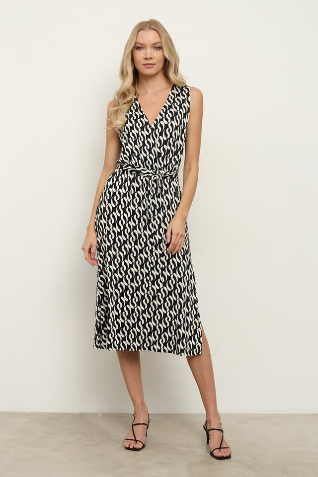 Платье Penny Black чёрно-белого цвета с оригинальным принтом и V-образным вырезом. Легкое и комфортное платье с запахом и поясом, идеально подходит для создания стильного образа. Состав: вискоза 95%, эластан 5%