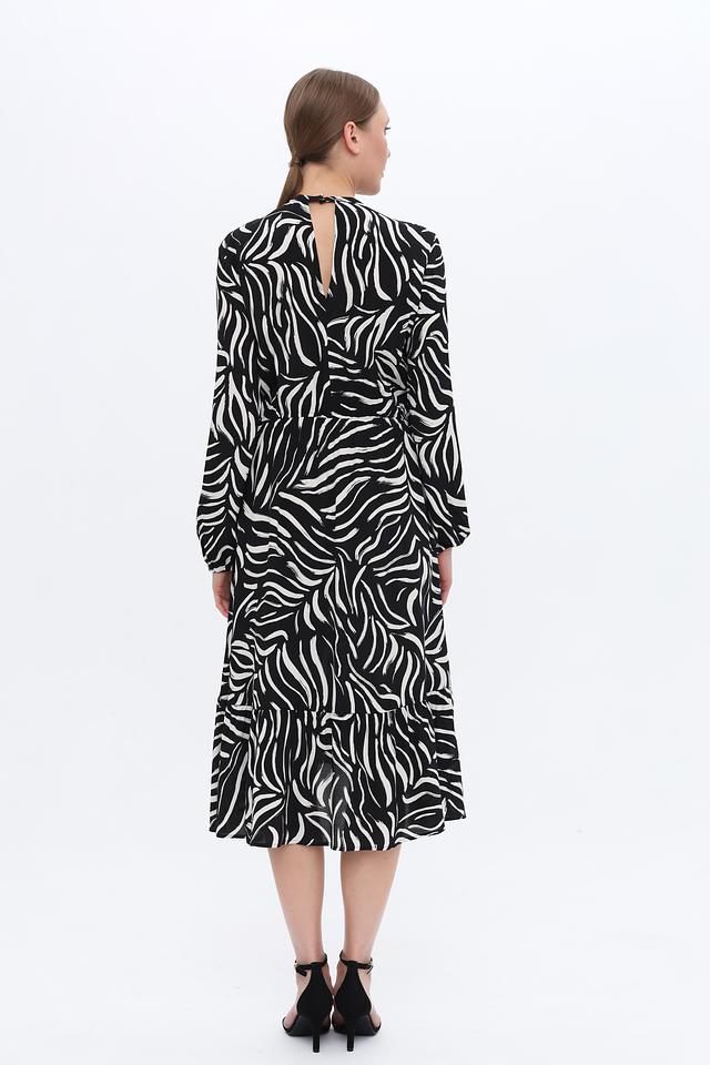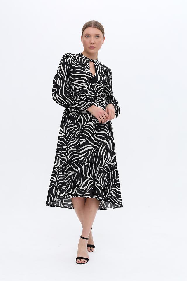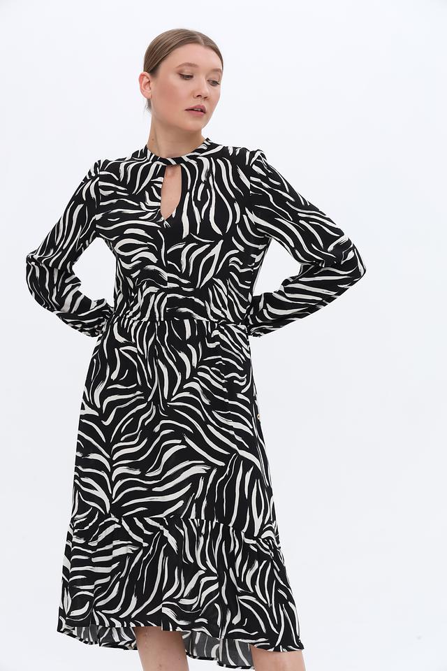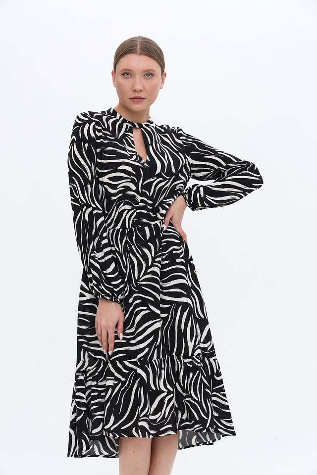 Основной цвет платья – чёрный, дополненный выразительным белым рисунком в полоску. Силуэт платья приталенный, с акцентом на талии благодаря эластичной вставке. Длинные рукава и вырез горловины с небольшим разрезом добавляют изысканности.