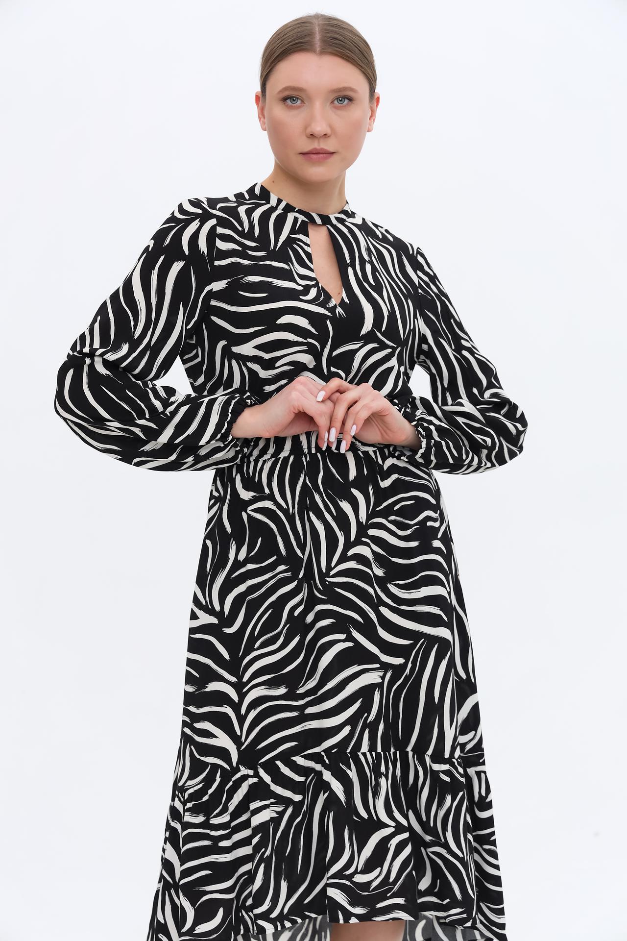- Дизайн: Яркий черно-белый принт "зебра" делает платье акцентным элементом гардероба. Классический крой и современный узор гармонично сочетаются.