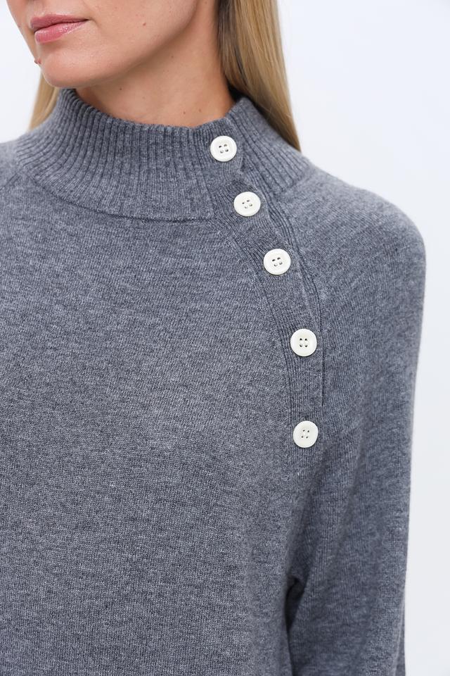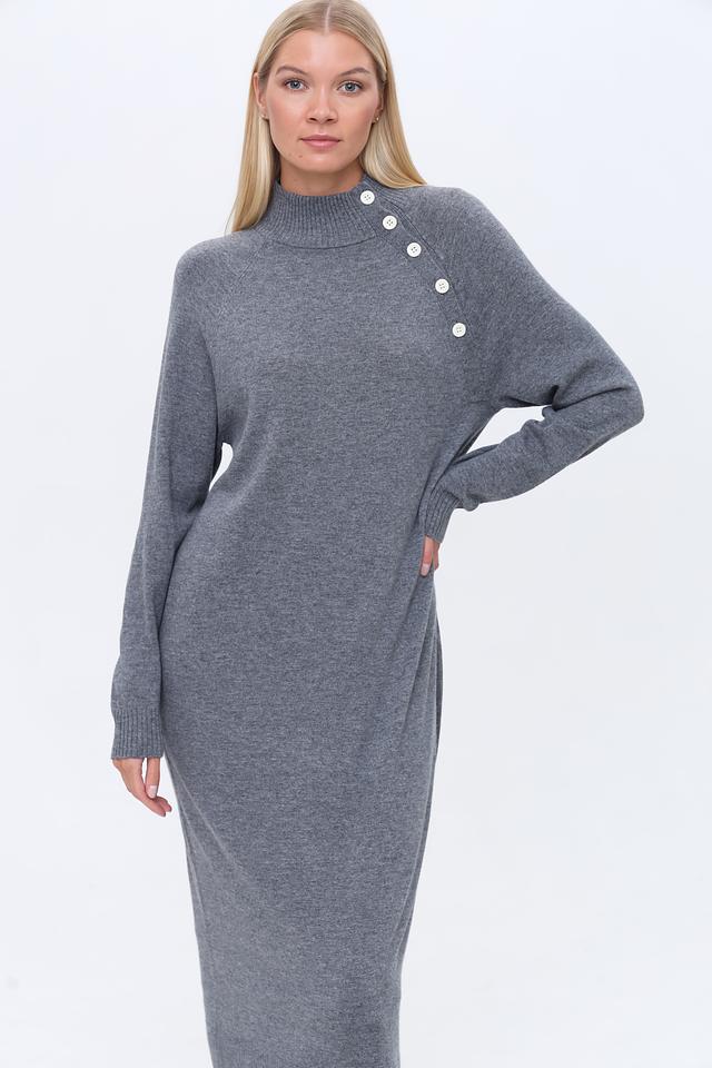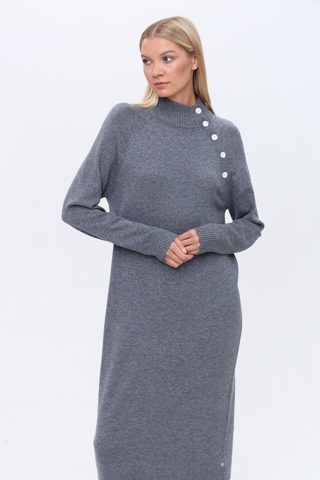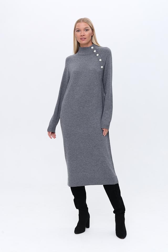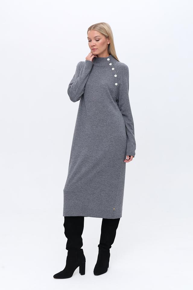 Серое вязаное платье от Penny Black выполнено из мягкого трикотажа с добавлением шерсти и кашемира. Модель имеет удобный прямой крой, высокую горловину и деликатную отделку в виде ряд пуговиц на плече. Состав: нейлон 35%, вискоза 31%, шерсть 30%, кашемир 4%