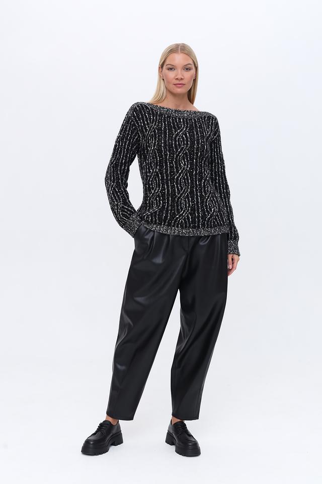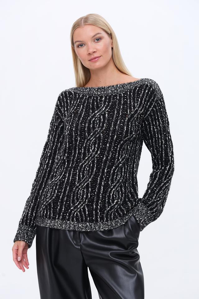 Чёрный джемпер Penny Black с выразительным узором из кос станет стильным дополнением к вашему гардеробу. Модель выполнена из мягкой пряжи с добавлением шерсти и альпаки, что обеспечивает комфорт и тепло. Состав: акрил 32%, хлопок 31%, шерсть 22%, нейлон 8%, альпака 7%