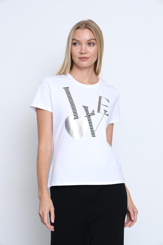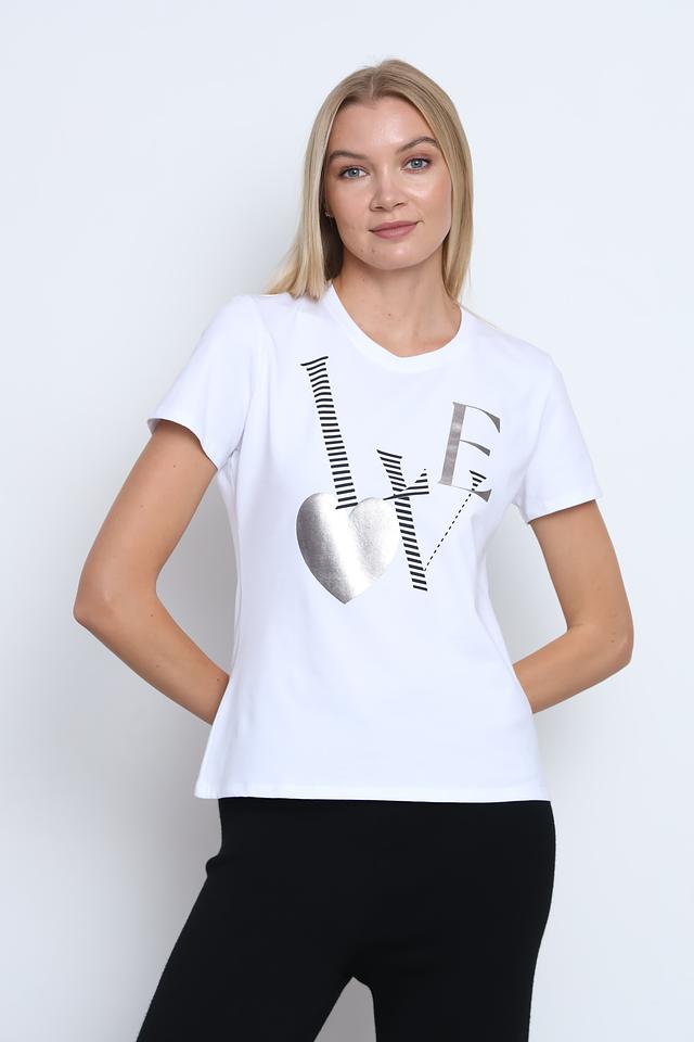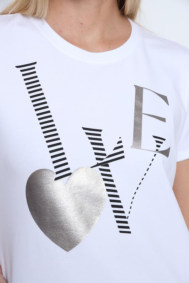Основной цвет футболки – белый, что делает ее универсальной и легко сочетаемой с другими элементами одежды. Главная особенность модели – стильный принт "LOVE", выполненный в черно-серебристой гамме. Принт состоит из графических элементов и изображения сердца, что придает футболке современный и модный вид.