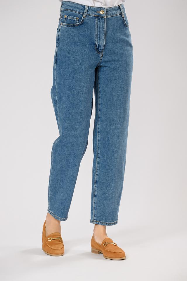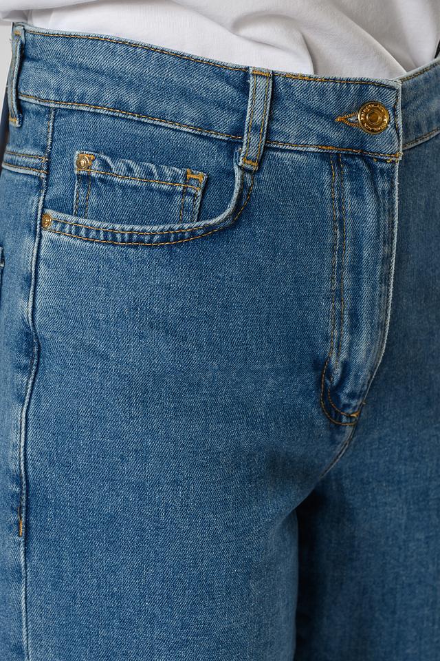 Брюки имеют прямой крой и высокую посадку в стиле mom fit, что делает их универсальными и подходящими для различных типов фигуры. Классический голубой цвет легко сочетается с другими элементами одежды, позволяя создавать разнообразные образы.