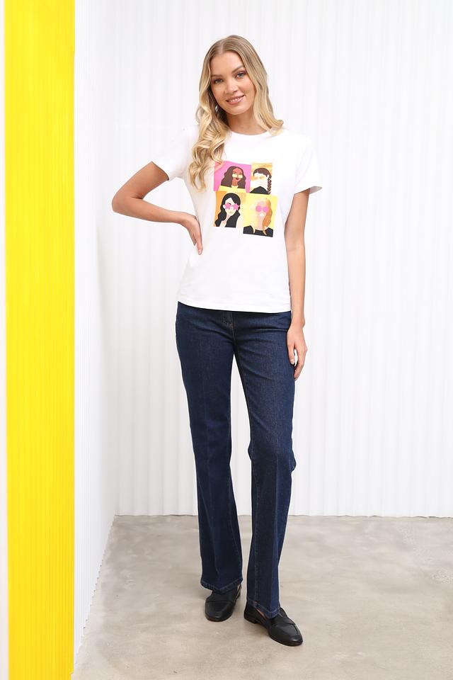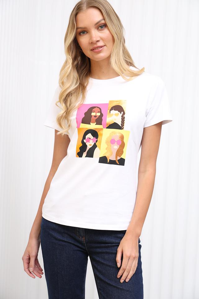Белая футболка Penny Black с ярким принтом в виде четырёх стилизованных портретов. Изготовлена из мягкого хлопка с добавлением эластана для комфорта и лучшей посадки. Идеальный выбор для создания повседневного образа. Состав: хлопок 95%, эластан 5%