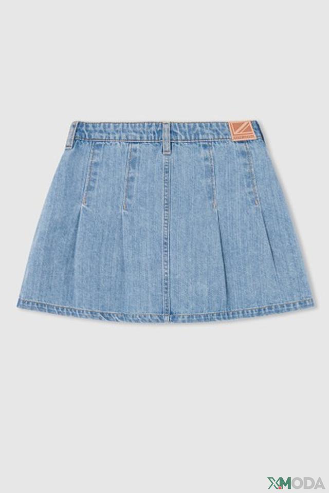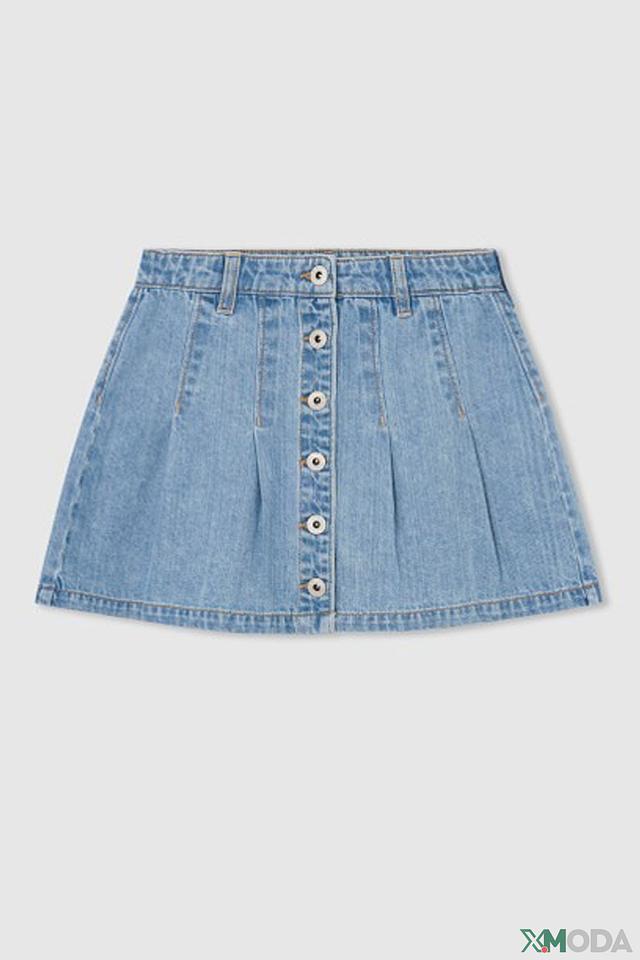 Юбка имеет классический джинсовый стиль с голубым оттенком. Застежка на пуговицы спереди добавляет оригинальности. Плиссированная юбка создает легкий и воздушный силуэт.