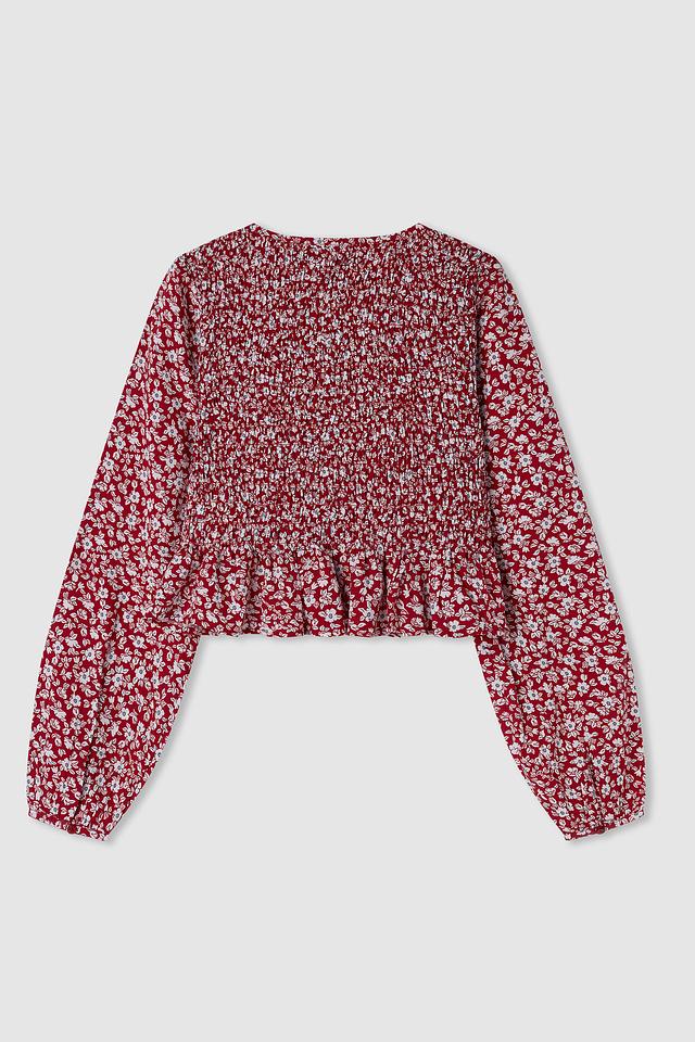 Блузка имеет яркий красный цвет, украшенный милым цветочным принтом в белых тонах. Длинные рукава и аккуратные сборки придают модели романтичный и женственный вид. Застежка выполнена на пуговицы, что облегчает процесс одевания и раздевания.