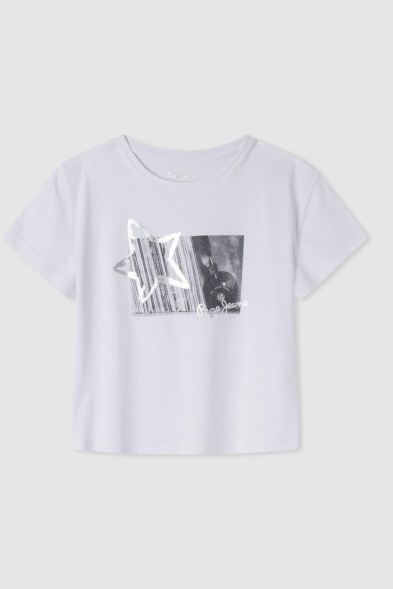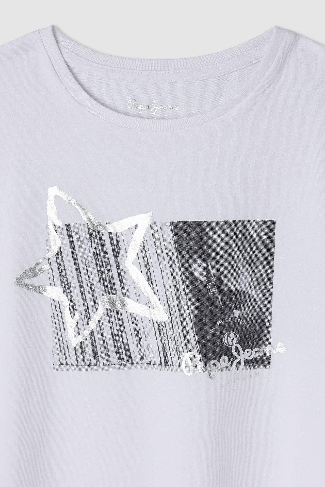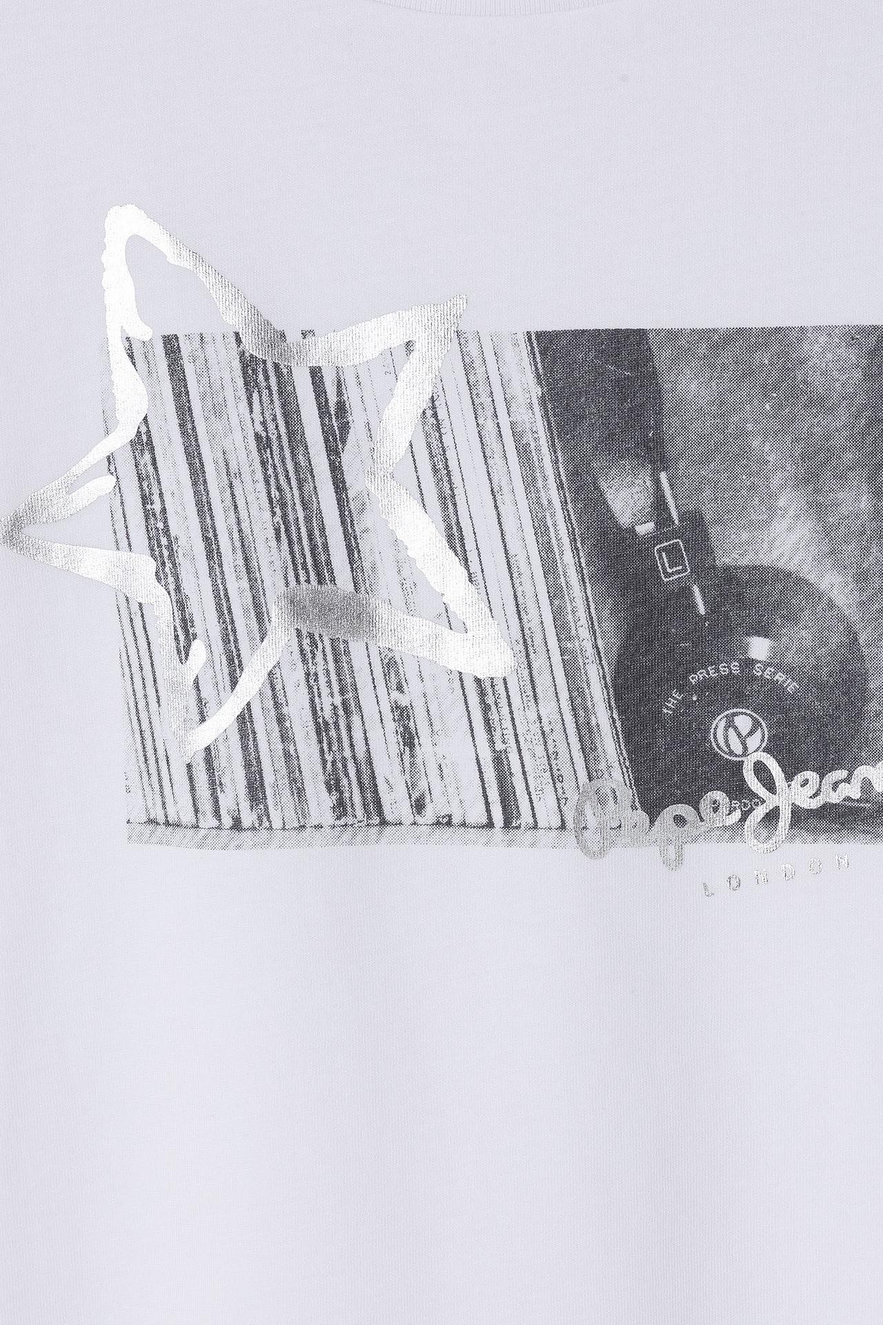Футболка выполнена в классическом белом цвете и украшена оригинальным принтом: серебристая звезда на фоне виниловых пластинок и наушников, а также логотип Pepe Jeans London. Качественный материал и стойкий принт гарантируют долговечность изделия и простоту в уходе, что очень важно для детской одежды.