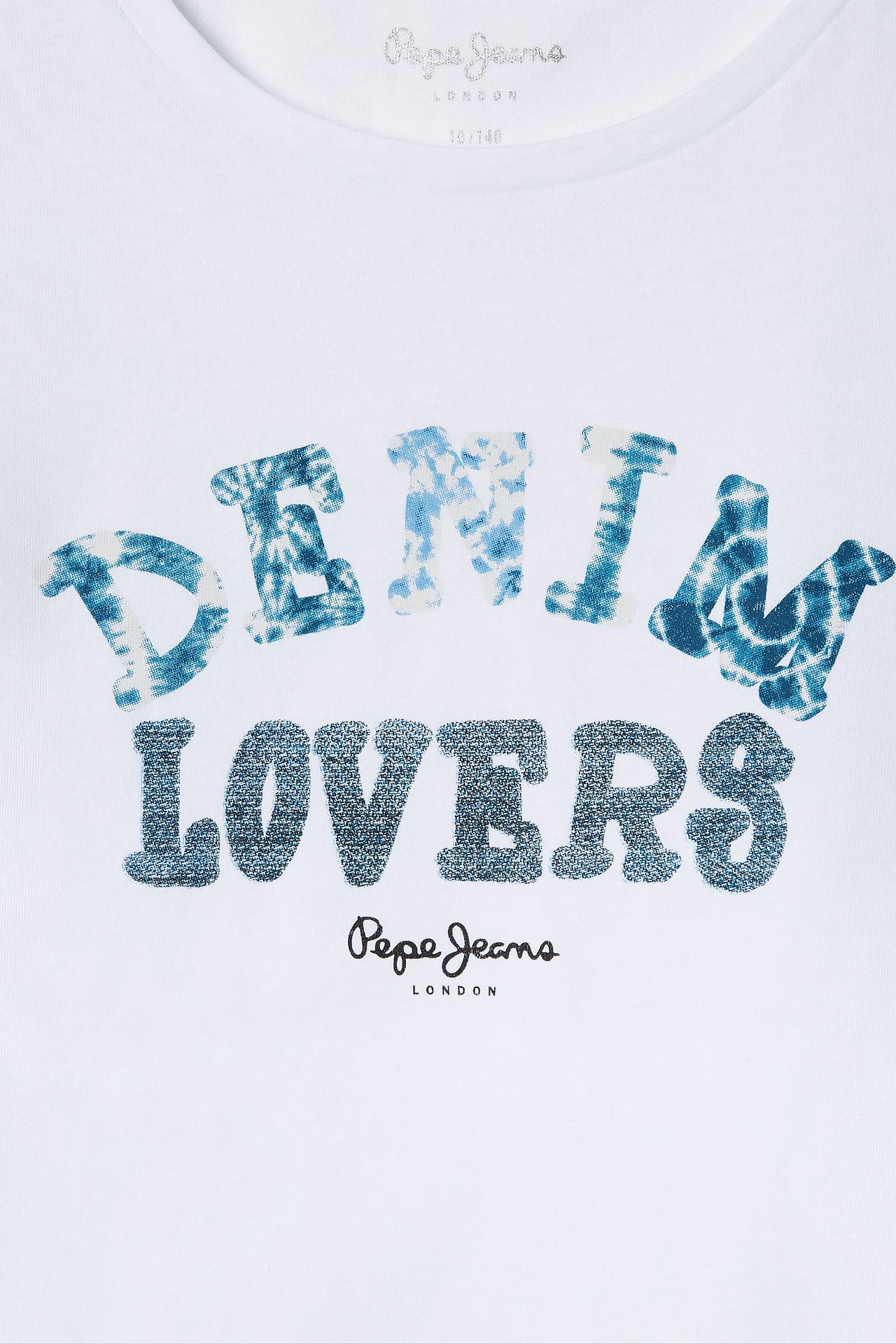 Эта очаровательная футболка Pepe Jeans London из 100% хлопка — идеальный выбор для юных модниц. Мягкая и дышащая ткань обеспечивает максимальный комфорт в течение всего дня, делая ее незаменимой для активных игр и повседневного ношения. Модель украшена стильным принтом "DENIM LOVERS" с эффектом тай-дай в оттенках синего, что придает ей современный и игривый вид.
