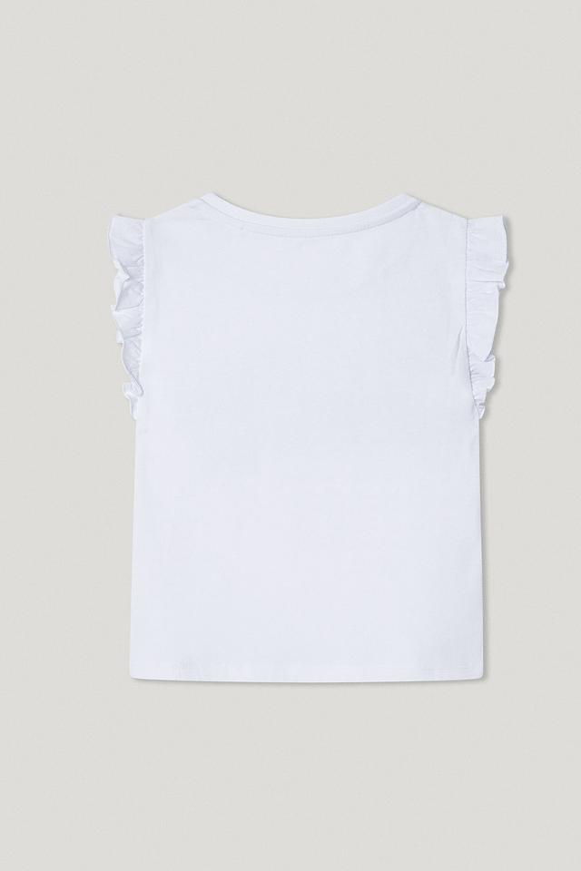 Белая футболка Pepe Jeans London для девочки с оригинальным принтом "Denim Lovers". Модель выполнена из 100% хлопка, имеет короткие рукава с оборками и удобный крой. Состав: хлопок 100%