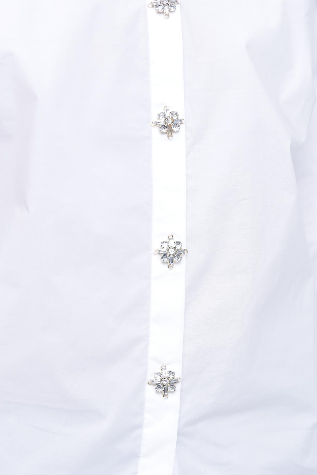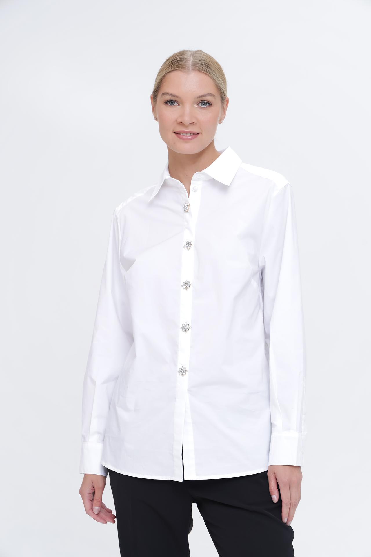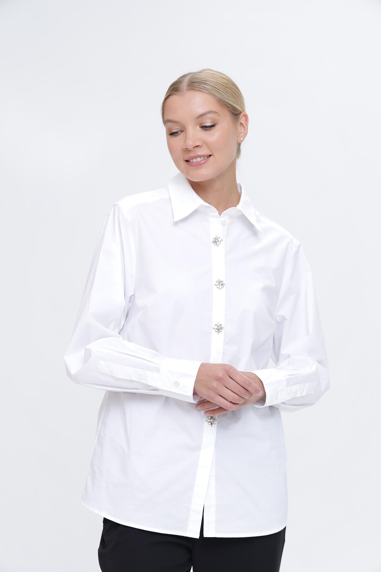 Благодаря классическому крою и белому цвету, эта рубашка станет базовым элементом вашего гардероба. Оригинальные пуговицы с декоративными элементами придают ей особый шарм и изысканность.