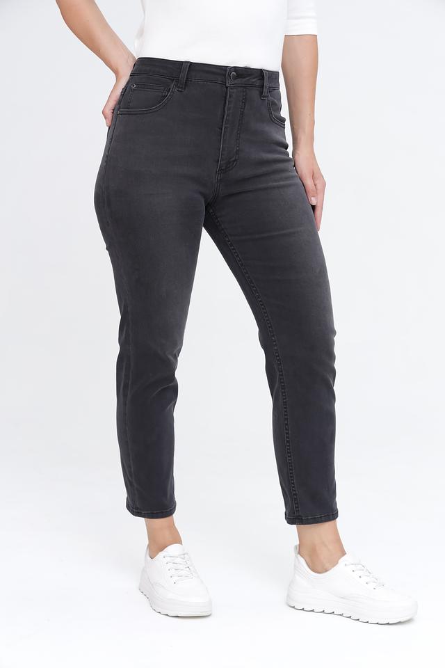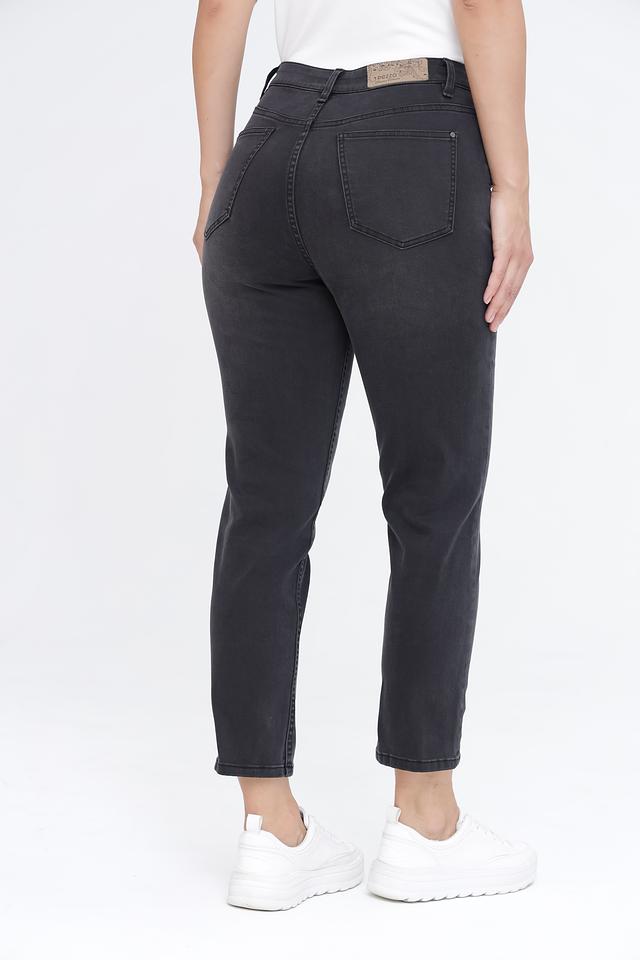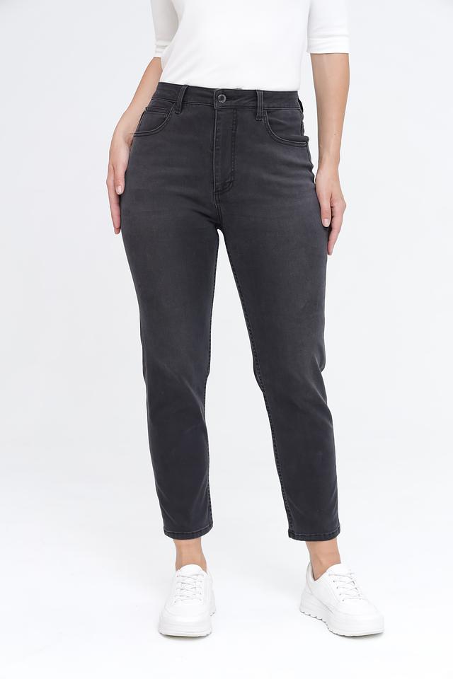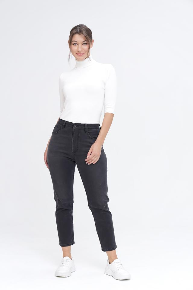 Джинсы отличаются высокой посадкой, что визуально удлиняет ноги и подчеркивает талию. Классический дизайн с пятью карманами делает их универсальным элементом гардероба, подходящим для создания различных образов.