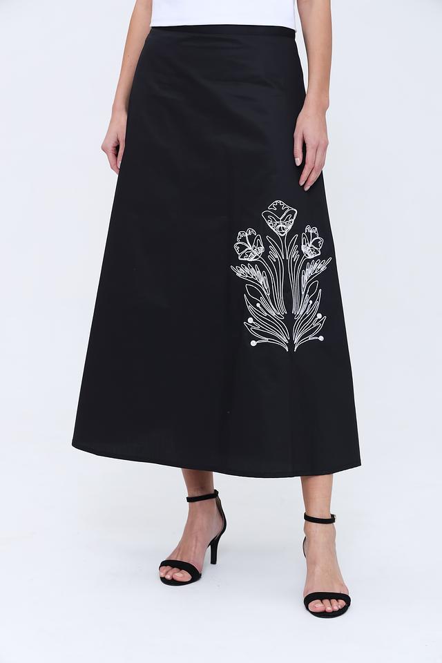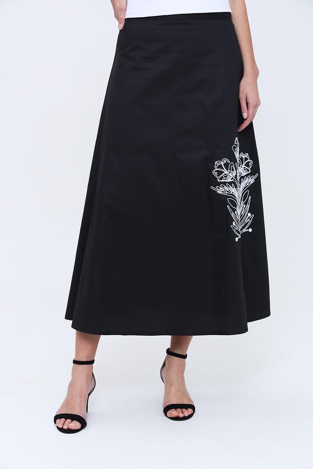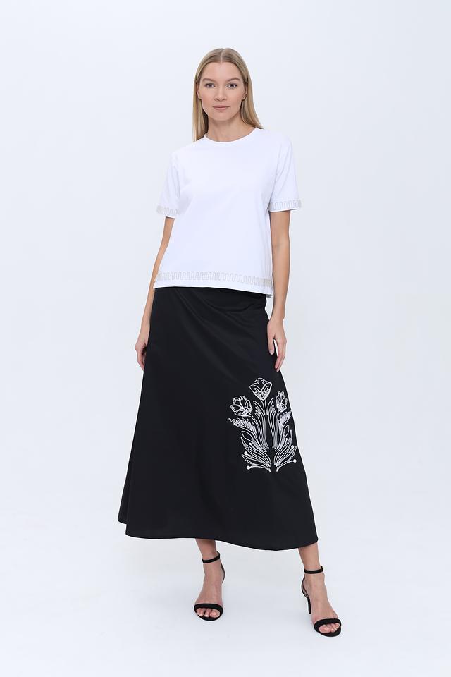 Юбка имеет длину макси и прямой крой, что обеспечивает комфортную посадку по фигуре. Особый акцент сделан на вышивку белым цветом, изображающую стилизованный цветочный орнамент. Эта деталь придает юбке изысканность и оригинальность.