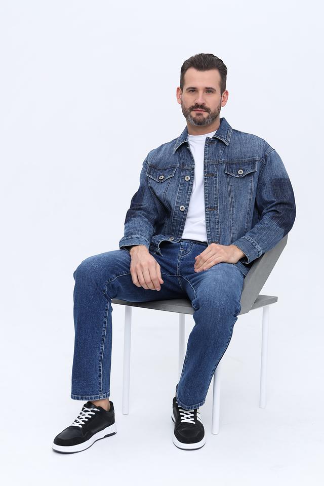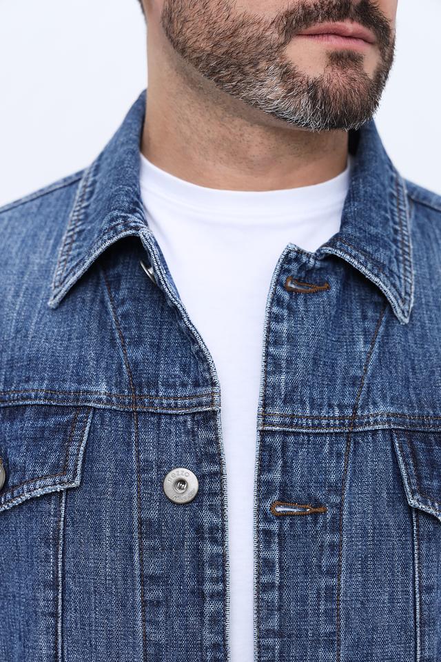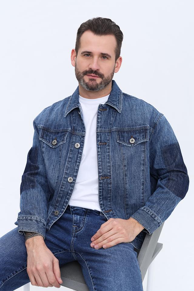 Куртка имеет классический джинсовый дизайн с отложным воротником и застежкой на пуговицах. На груди и рукавах расположены накладные карманы, добавляющие функциональности и стиля. Цвет куртки – насыщенный синий, с эффектом лёгкого выцветания, что придаёт ей винтажный вид.