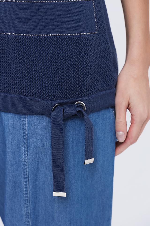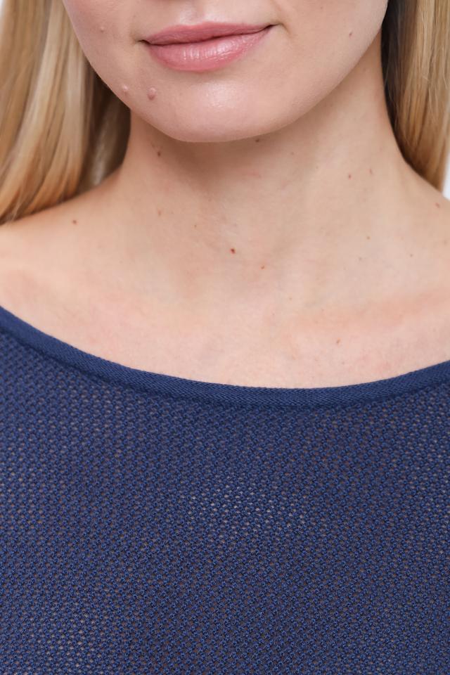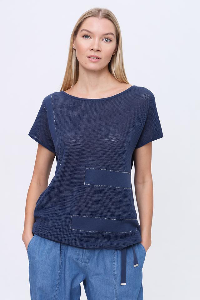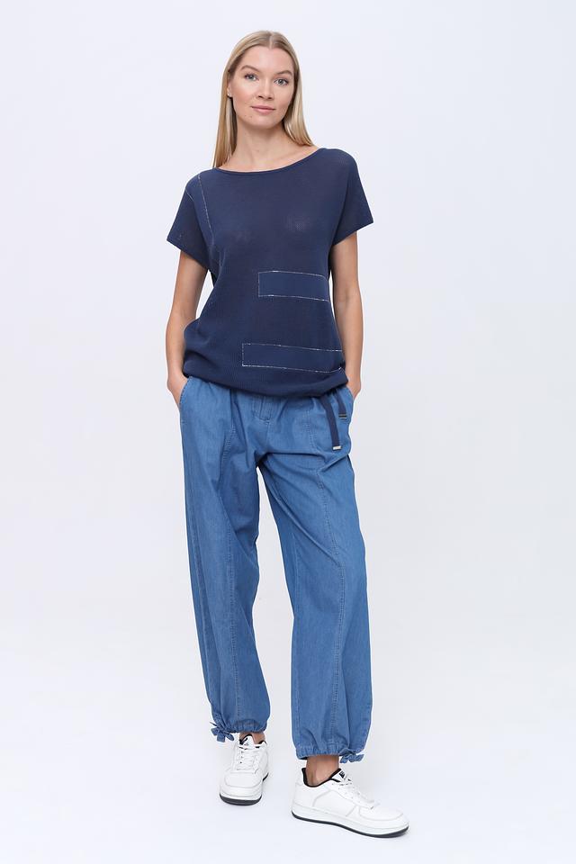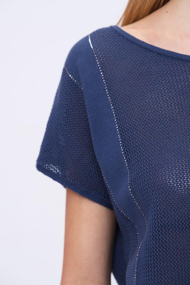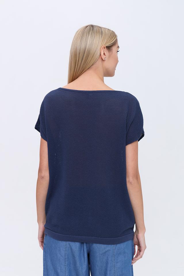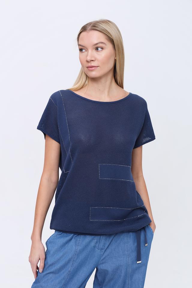 Пуловер имеет насыщенный синий цвет и свободный крой, который позволяет создать расслабленный и непринужденный образ. Округлый вырез горловины и короткие рукава делают его идеальным для теплой погоды.