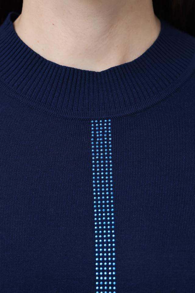 Особенностью данного пуловера является вертикальная полоса из сверкающих страз, которая добавляет изделию изысканности и привлекает внимание. Высокий воротник-стойка придает образу элегантность и защищает от холода.