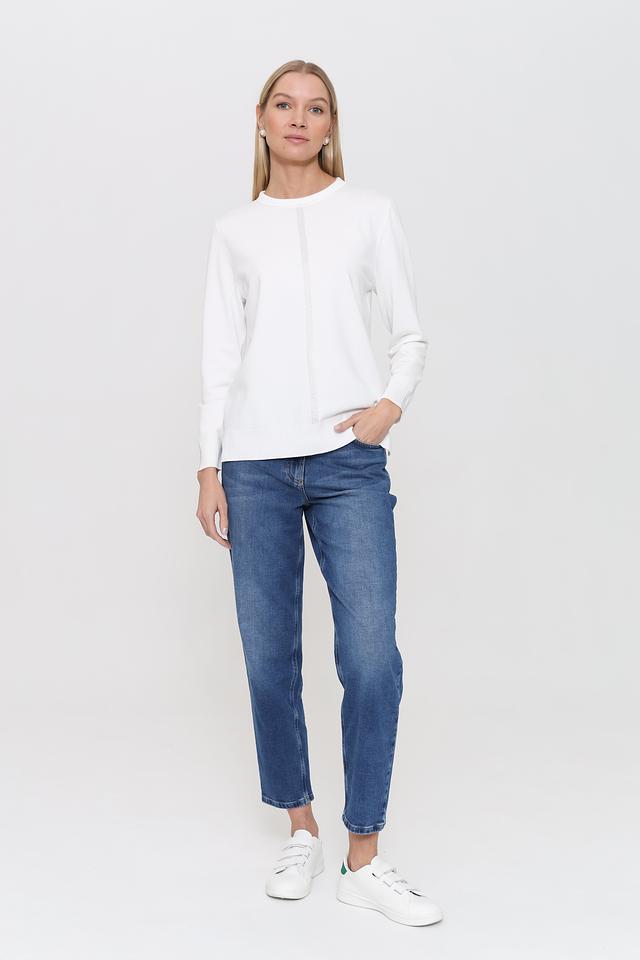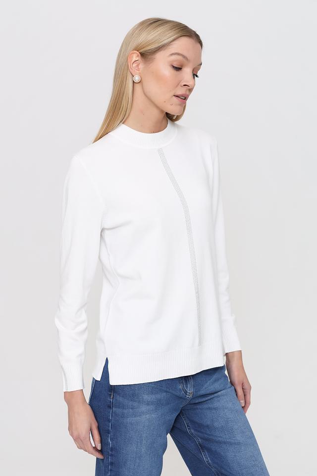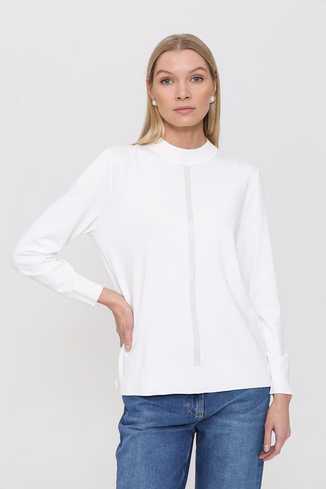 Пуловер имеет прямой крой и длинные рукава, что обеспечивает комфортную посадку по фигуре. Особый акцент сделан на вертикальной линии декора из страз, которая придает изделию изысканность и привлекательность.