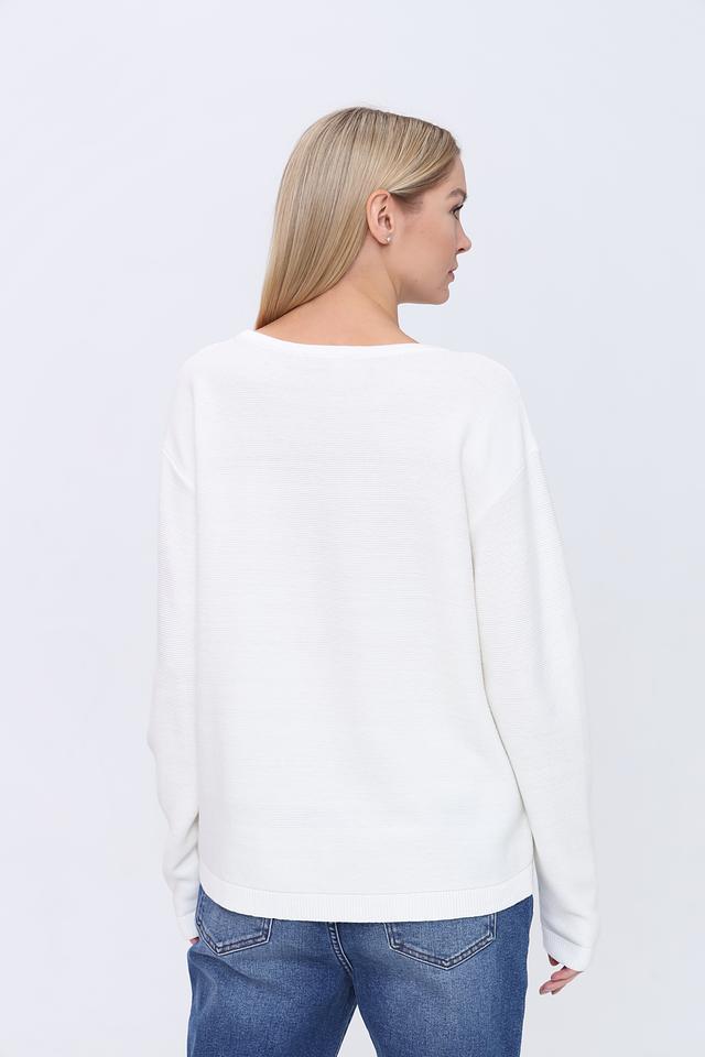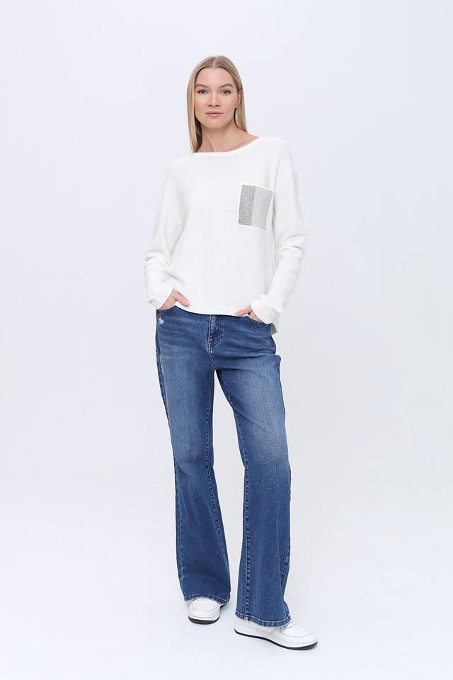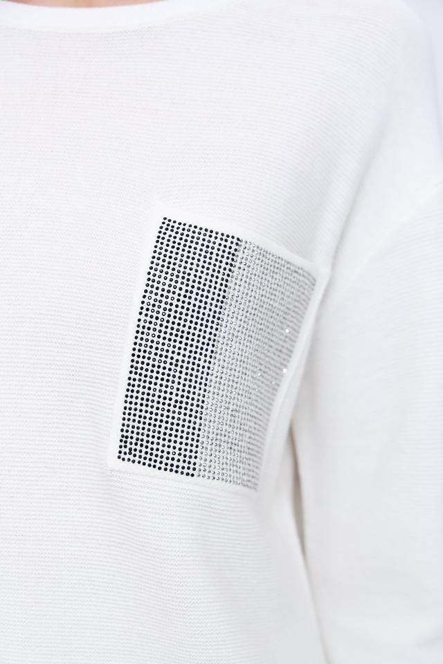 Пуловер имеет свободный крой, который обеспечивает комфорт и свободу движений. Декоративный элемент в виде геометрического узора добавляет изделию оригинальности и привлекательности. Выразительный акцент выполнен в серебристых тонах.