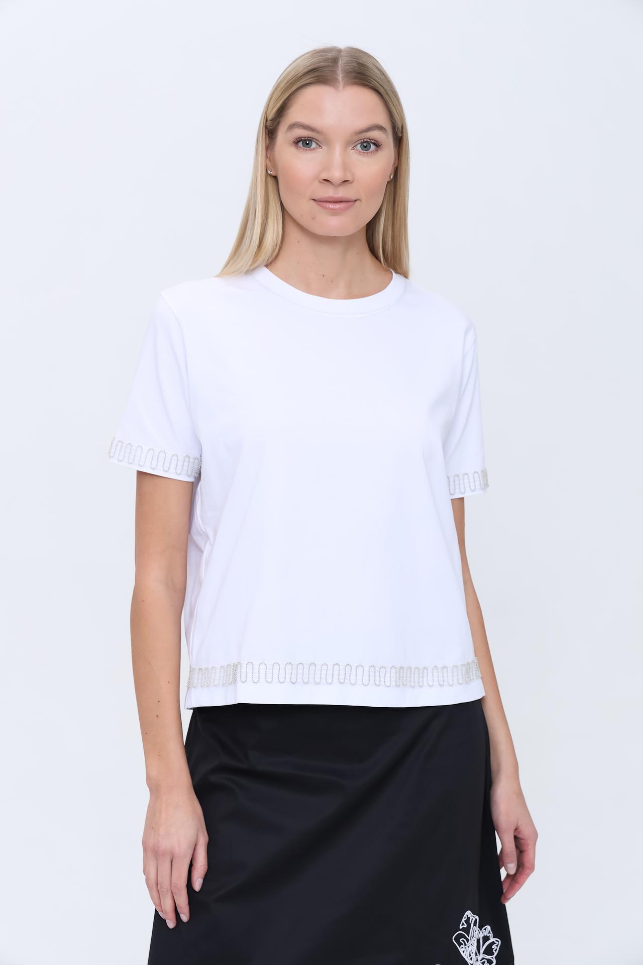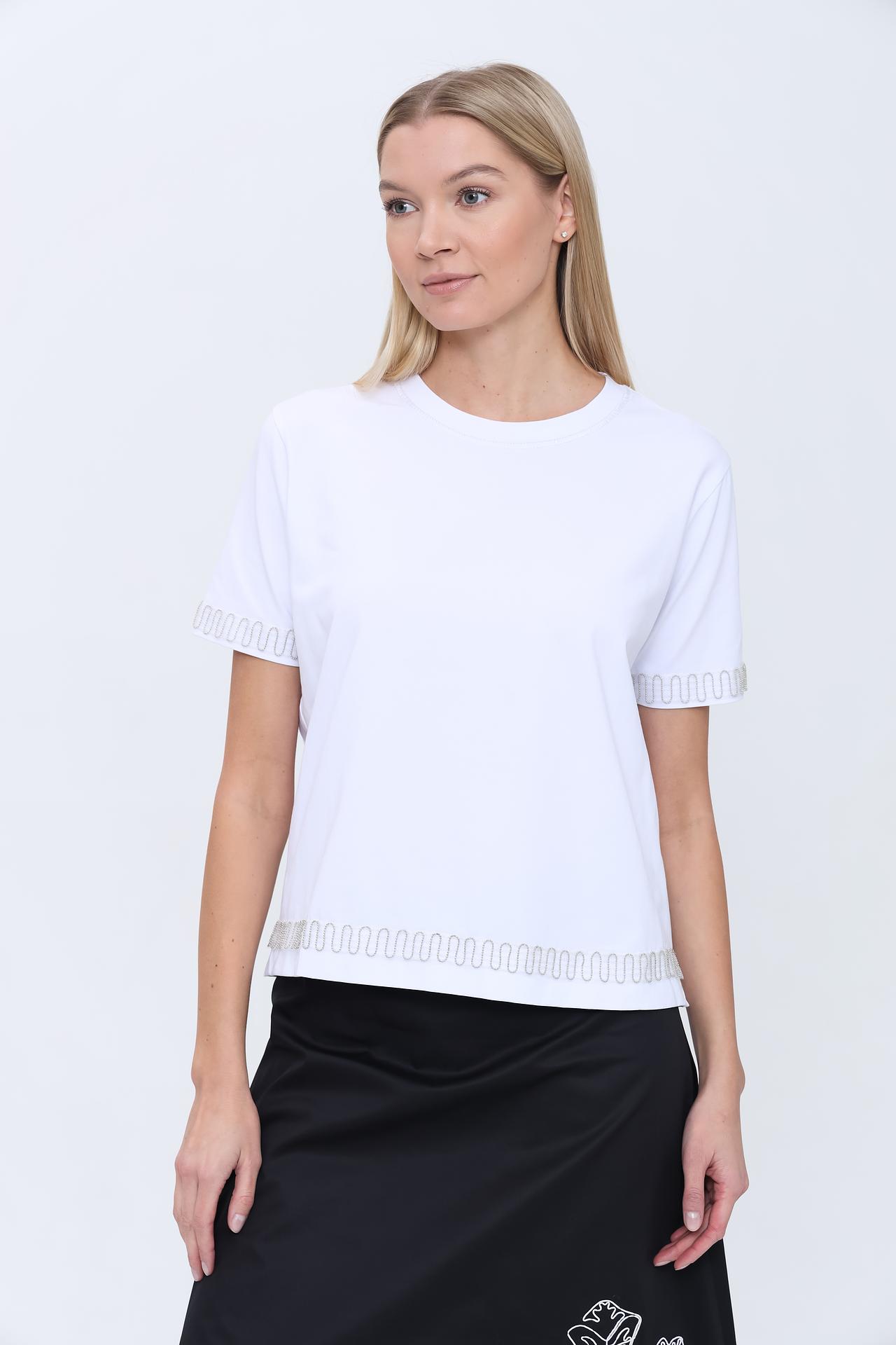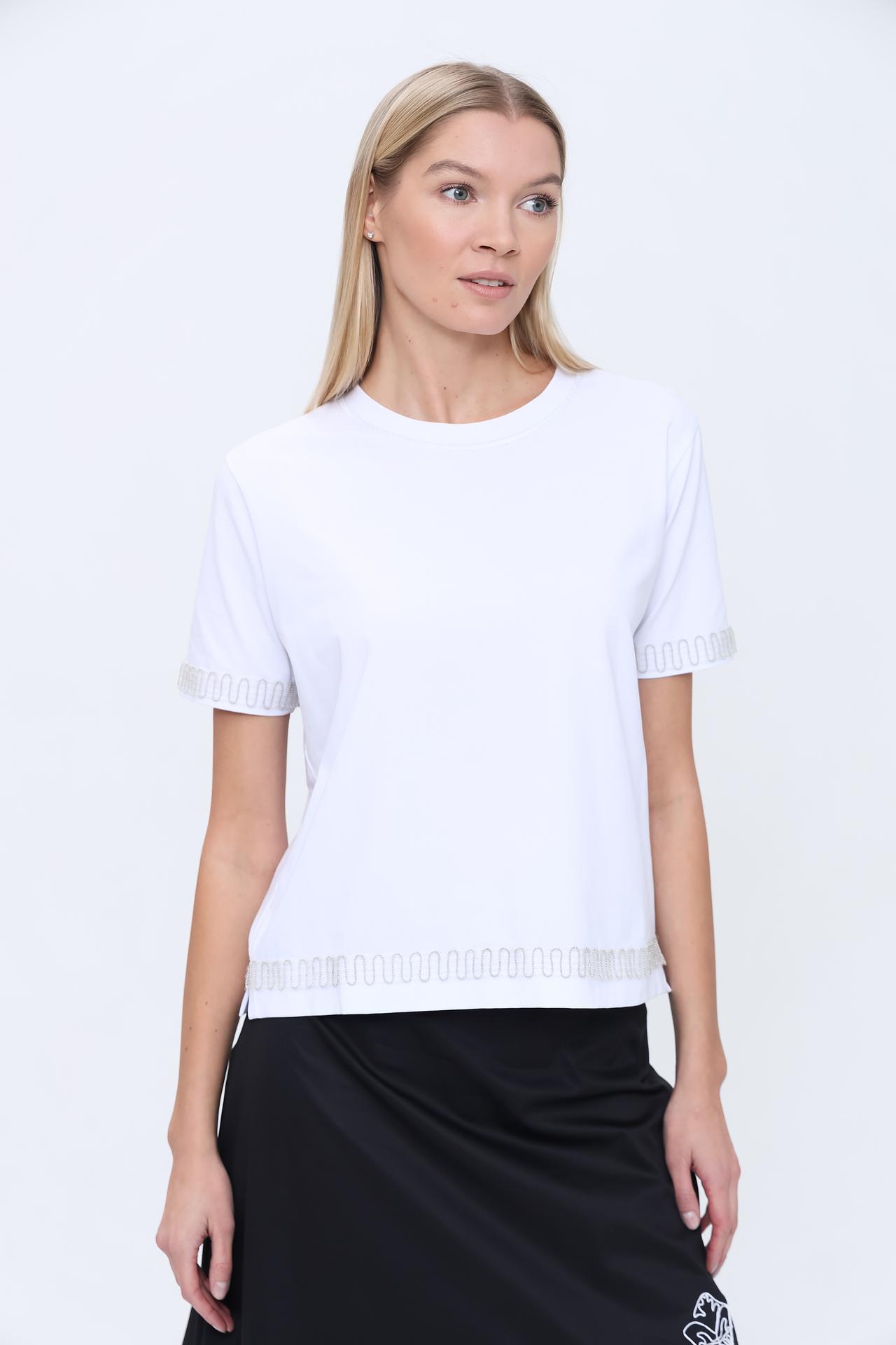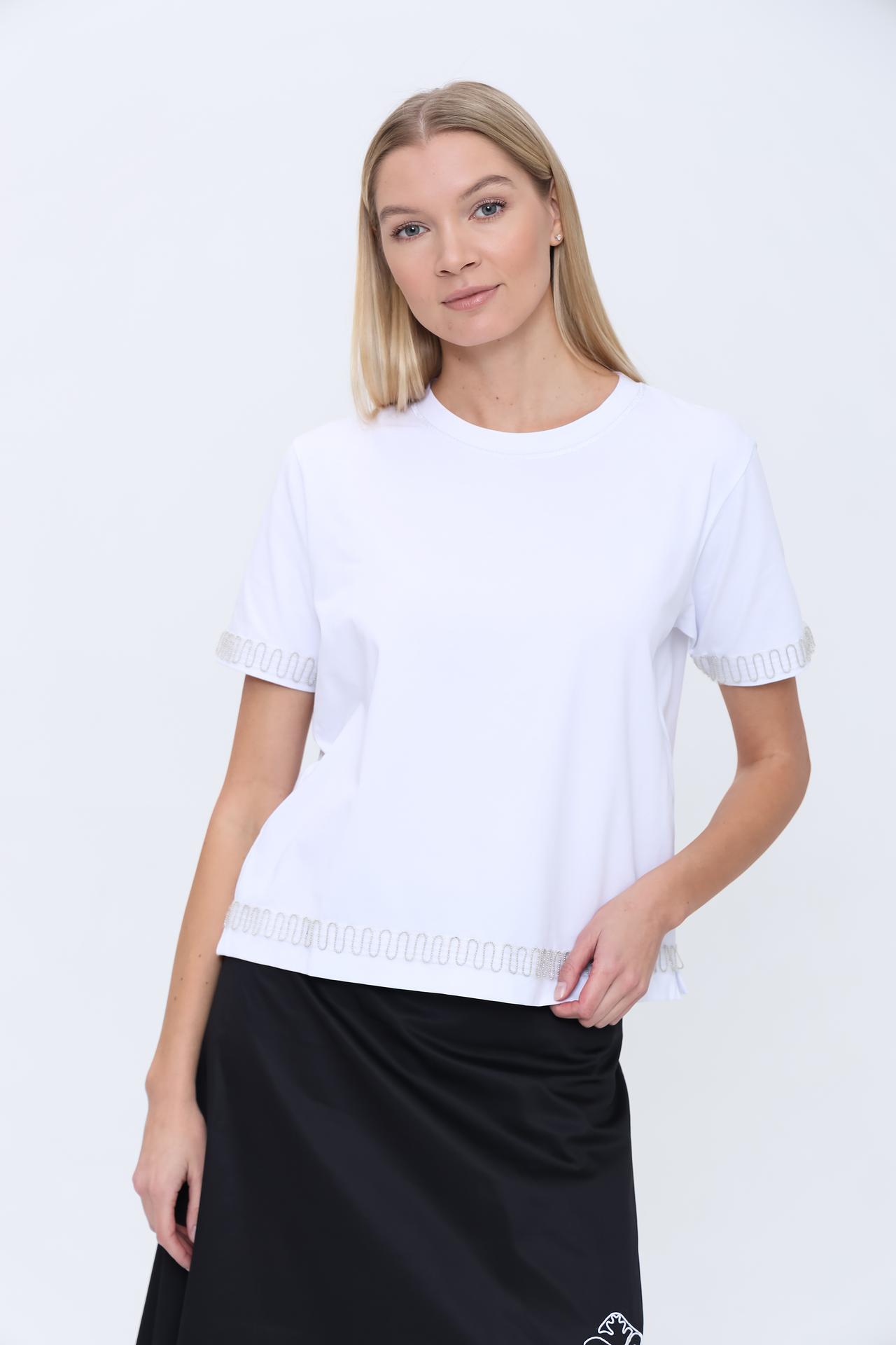 - Декоративная отделка: Оригинальная отделка по низу и рукавам добавляет изюминку и делает футболку запоминающейся.