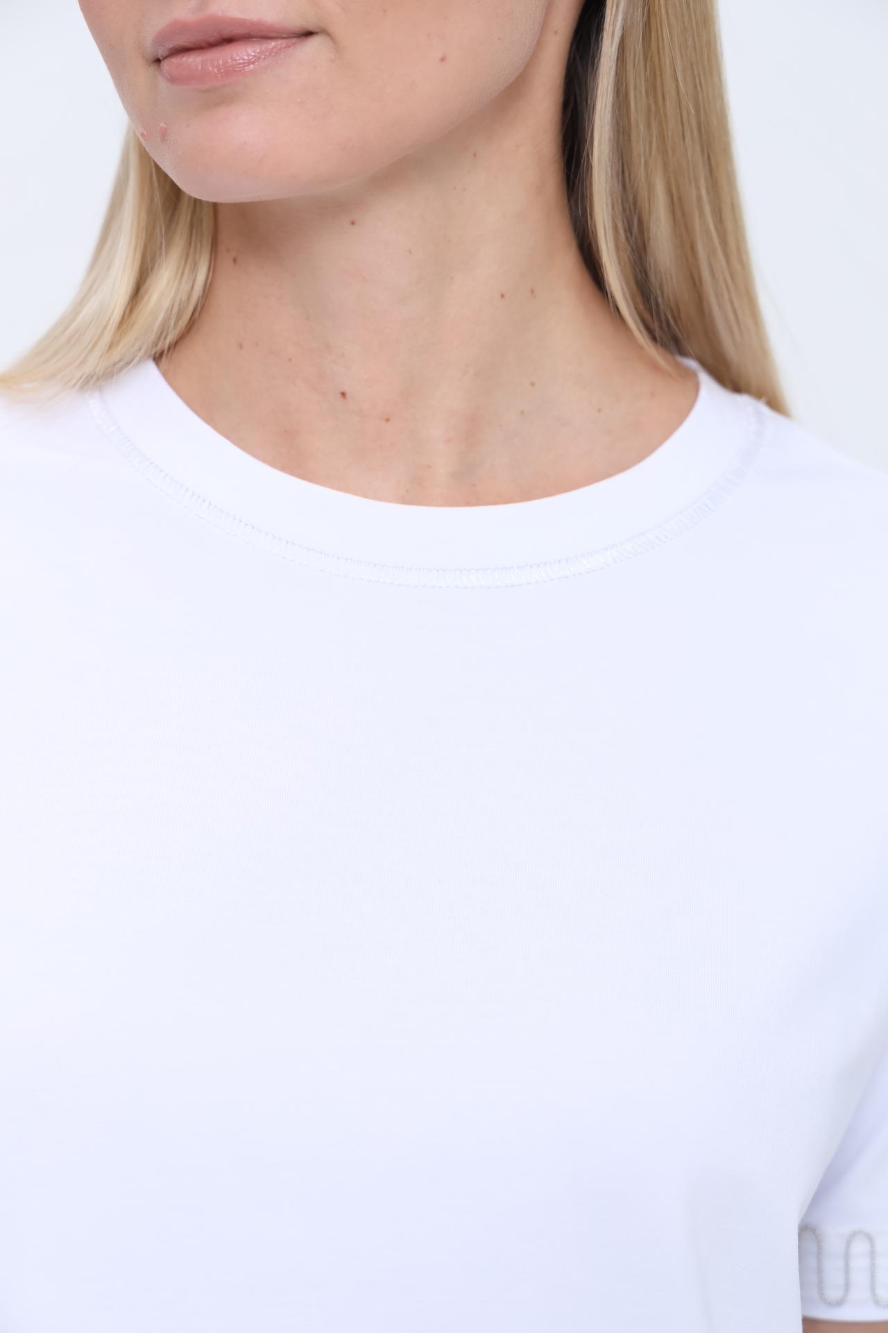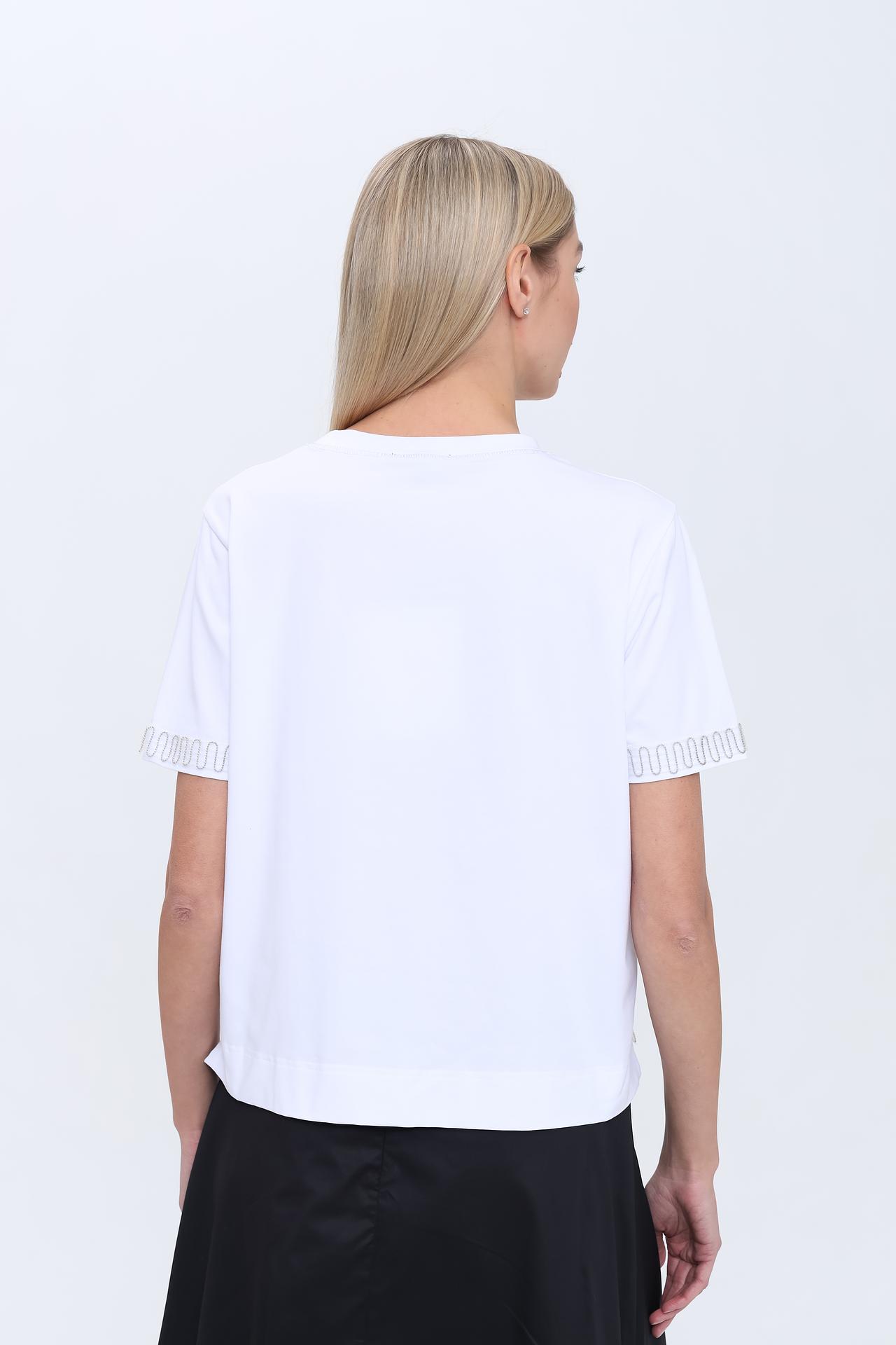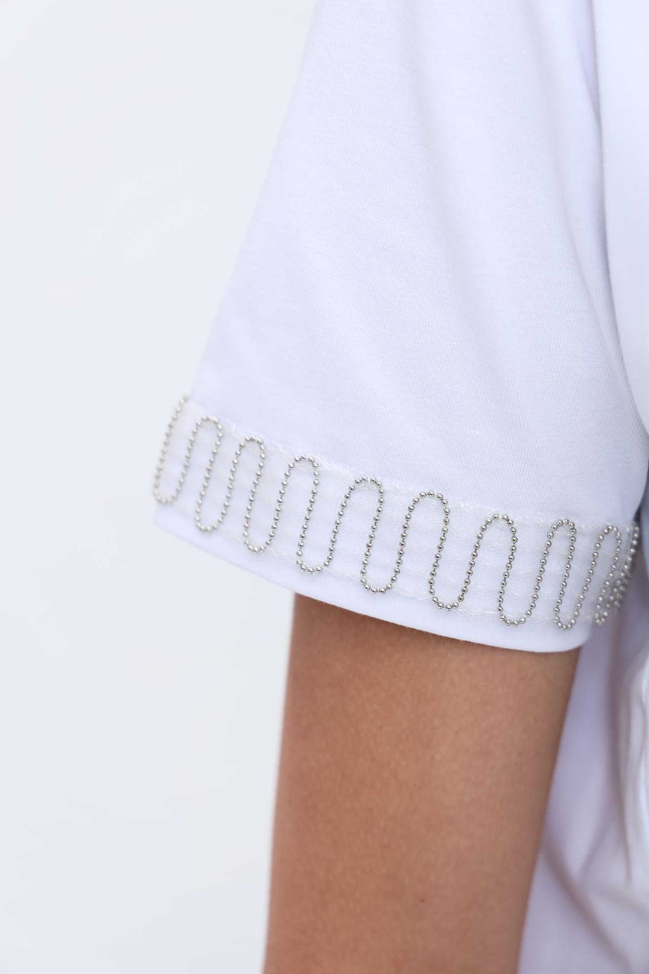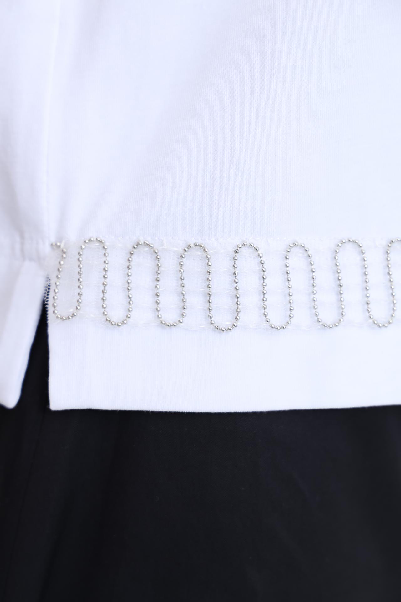 - Декоративная отделка: Оригинальная отделка по низу и рукавам добавляет изюминку и делает футболку запоминающейся.