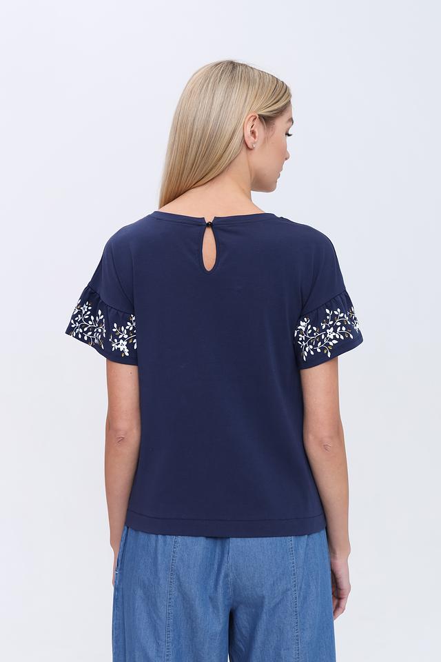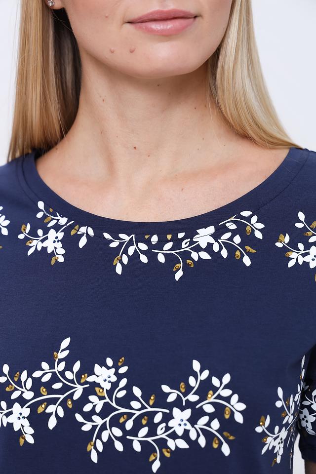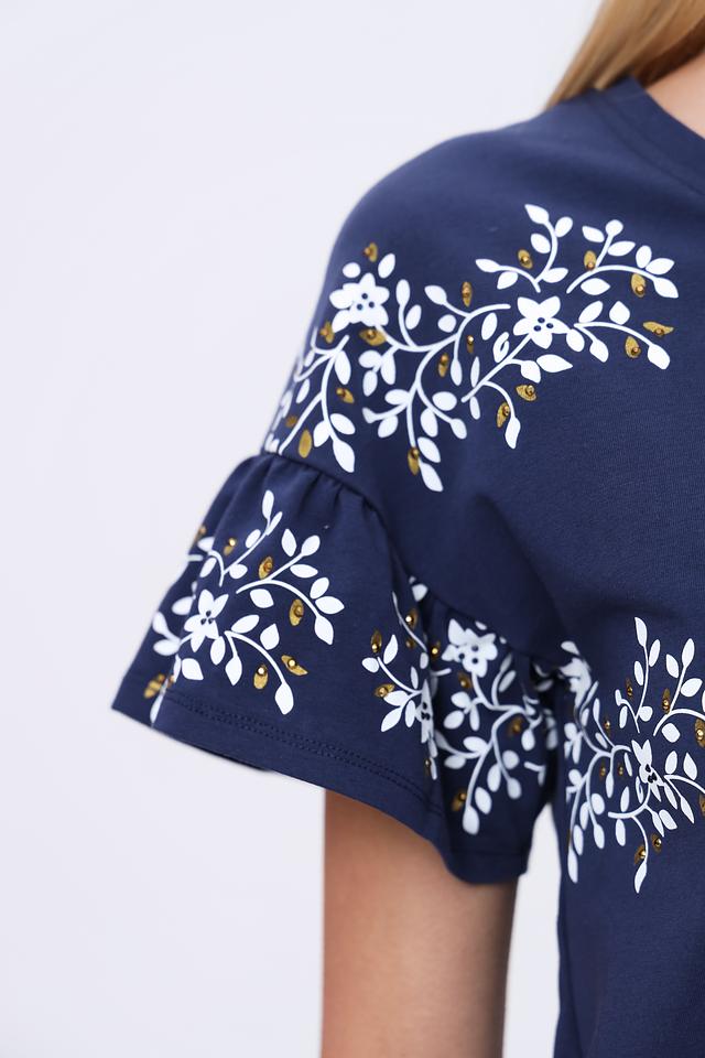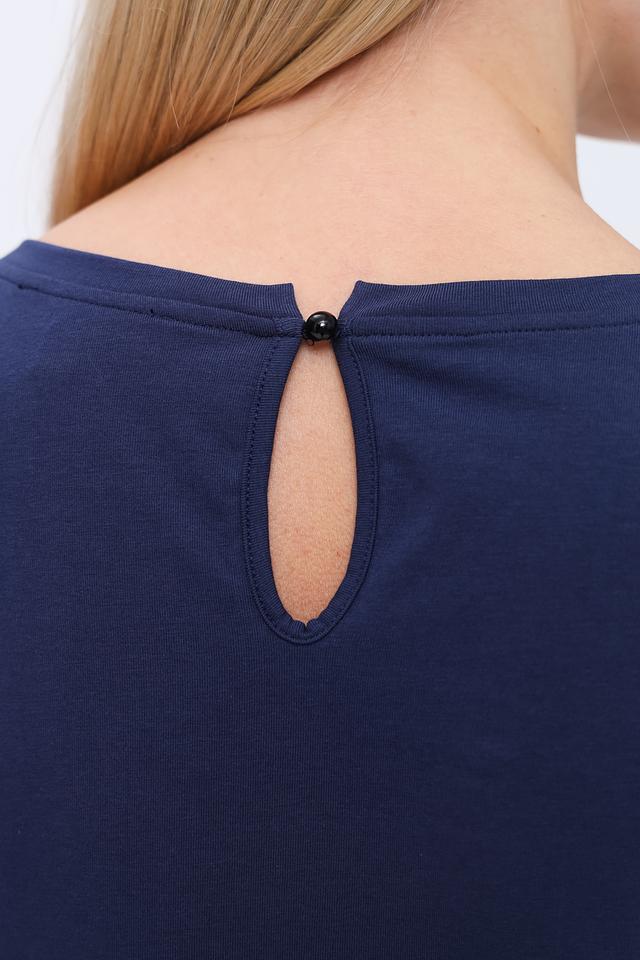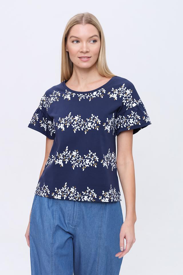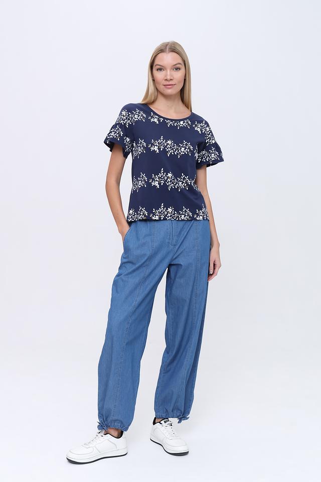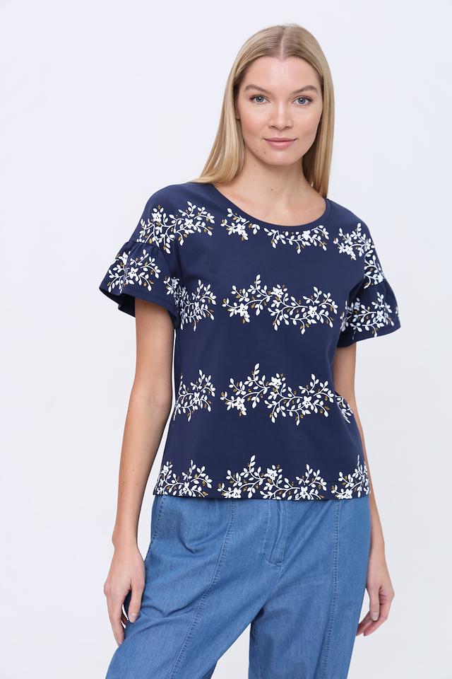 Блуза имеет круглый вырез горловины и короткие рукава с воланами, что делает ее женственной и легкой. Спинка блузы имеет небольшой вырез-капельку. Благодаря составу – 95% хлопок и 5% эластан – блуза приятна к телу, хорошо дышит и не сковывает движения.