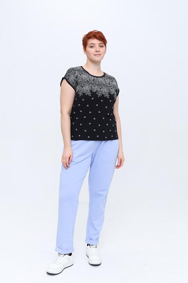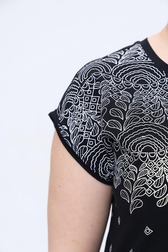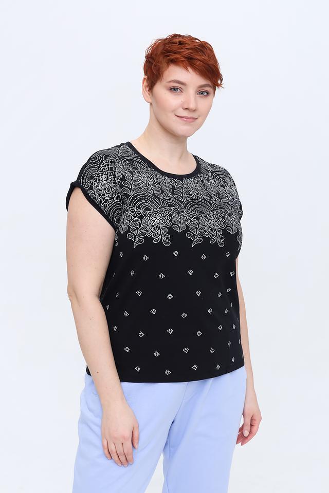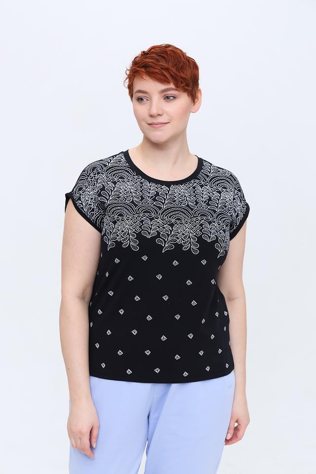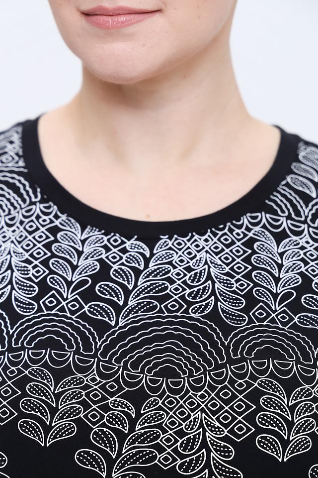 Основной цвет футболки – чёрный, который служит идеальным фоном для яркого и детализированного цветочного принта. Принт выполнен в белых тонах и изображает стилизованные цветы и листья, создавая эффектный и запоминающийся образ.