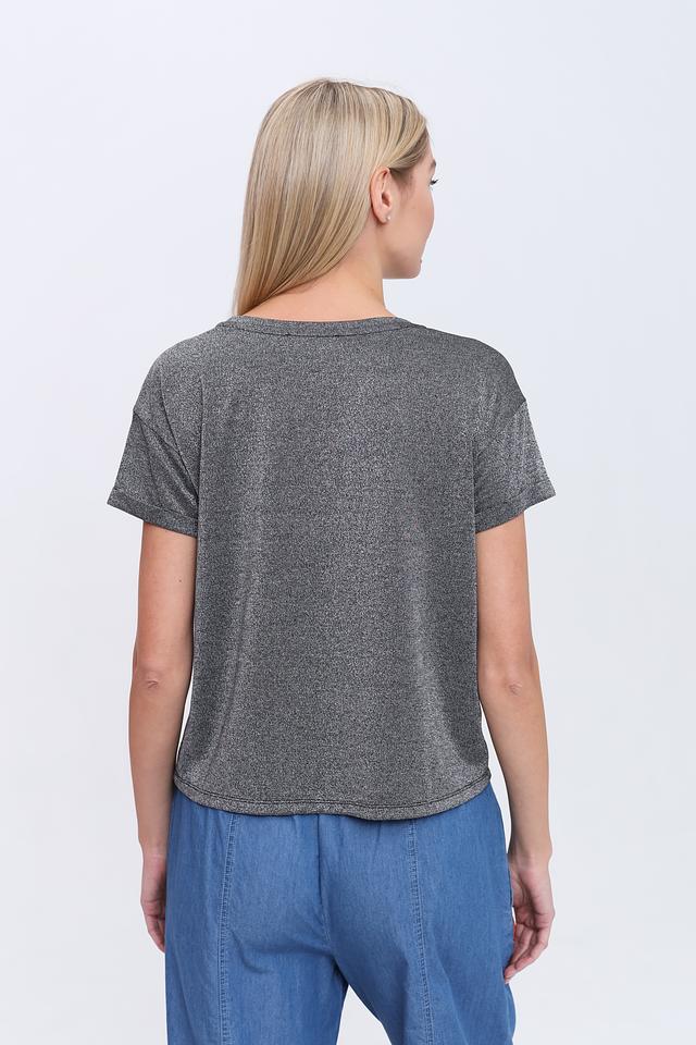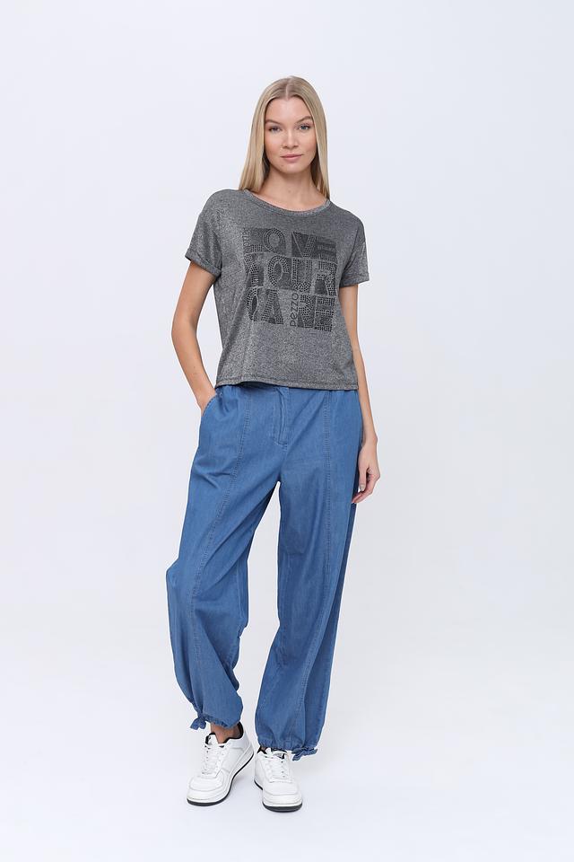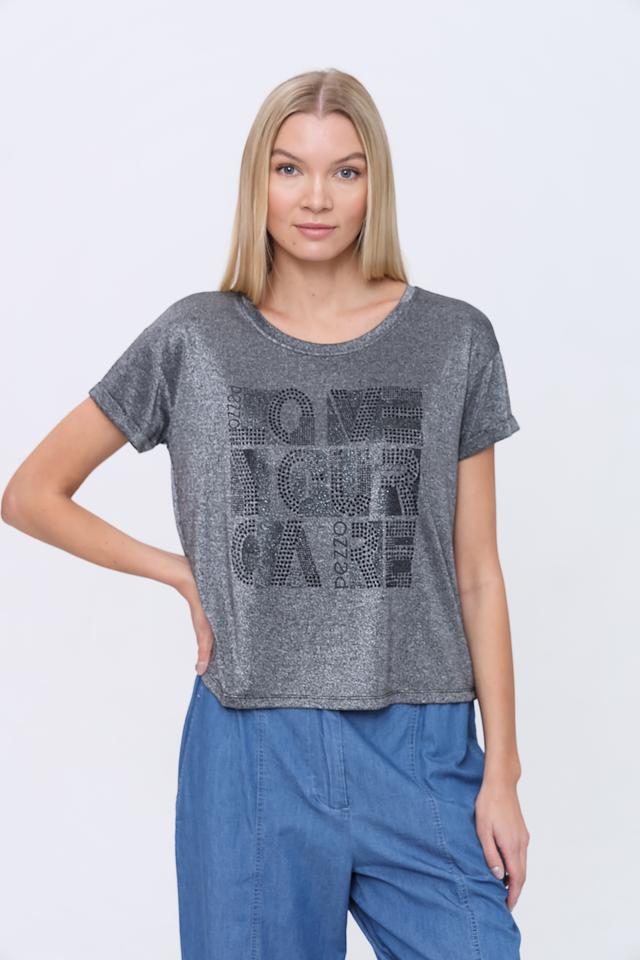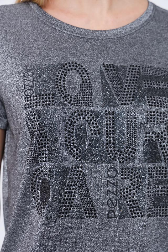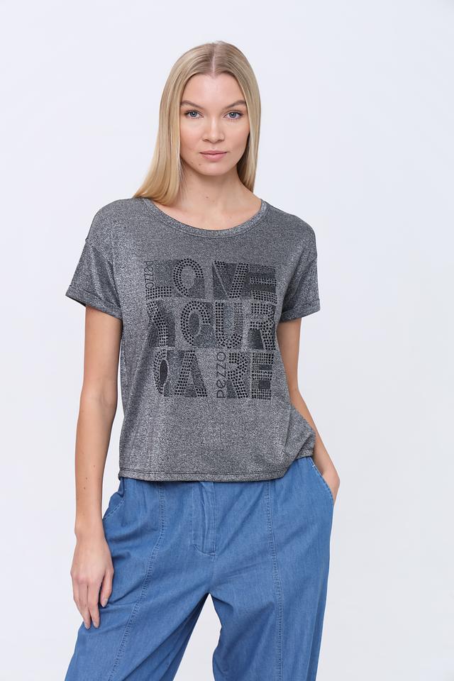 Женская футболка Pezzo серого цвета с эффектным принтом и декоративной отделкой. Изготовлена из мягкой вискозы с добавлением эластана для комфортной посадки. Стильный и удобный вариант для повседневного образа. Состав: вискоза 72%, металл 25%, эластан 3%