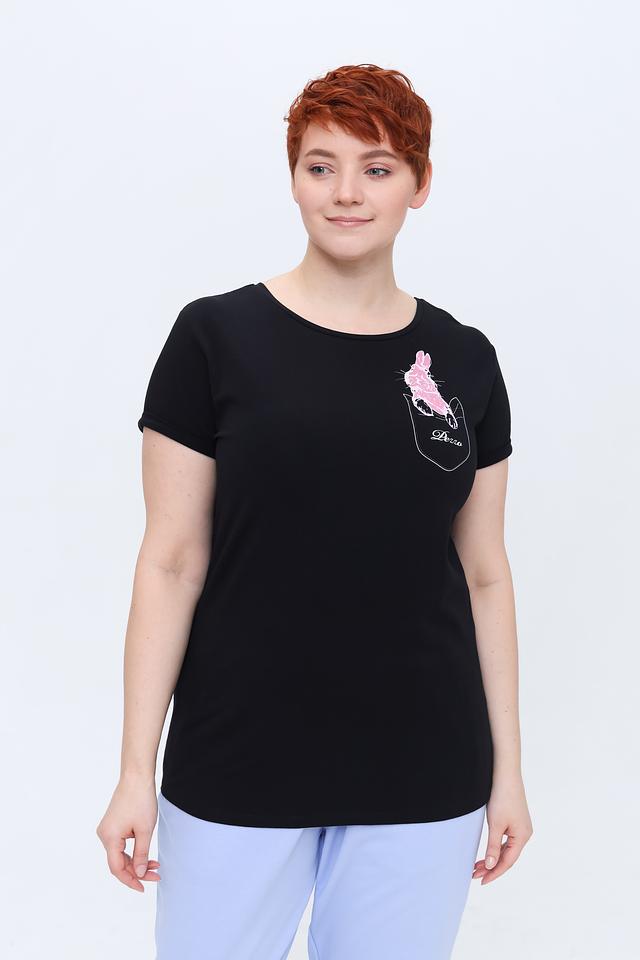 Основным акцентом футболки является яркий принт в виде розового зайчика, выглядывающего из кармана. Этот милый и забавный элемент добавляет образу игривости и оригинальности.