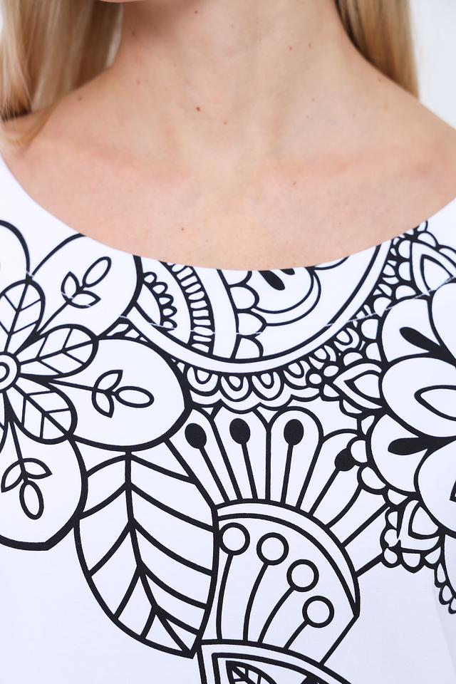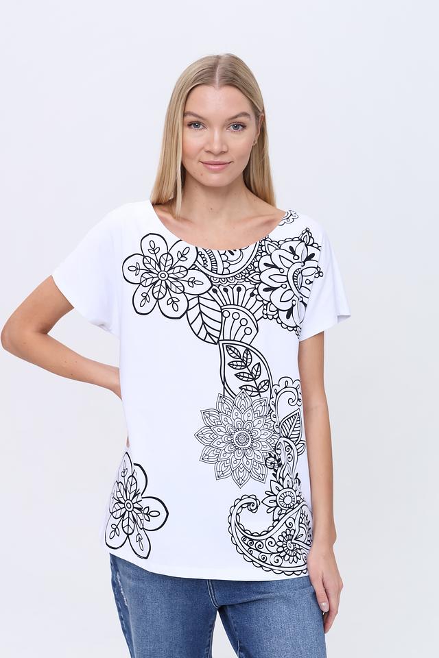 Основной цвет футболки – белый, что делает её универсальной и легко сочетаемой с другими элементами одежды. Главная особенность модели – эффектный чёрно-белый принт, изображающий сложный цветочный орнамент. Этот рисунок добавляет образу оригинальности и выразительности.