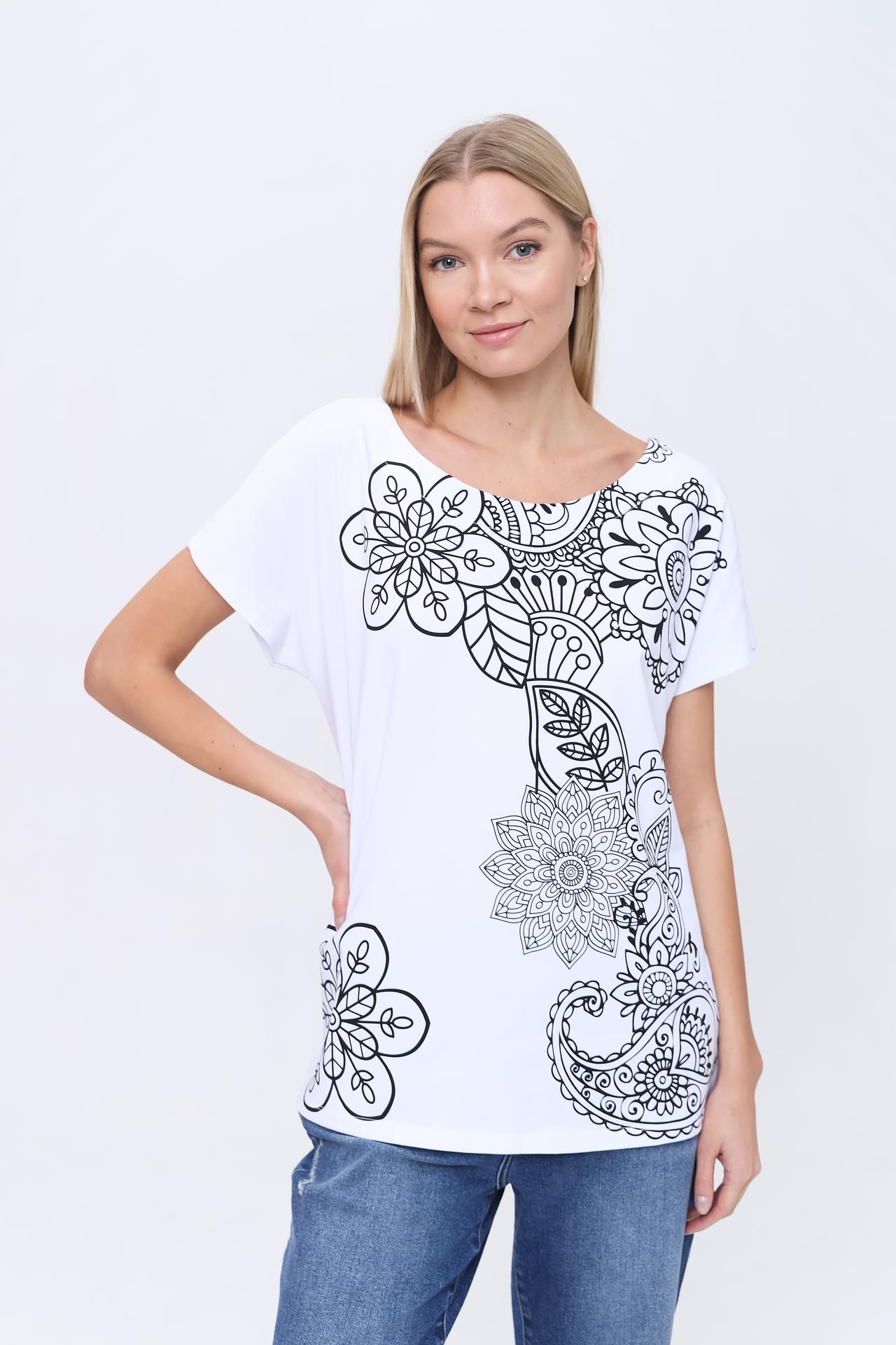 Белая футболка Pezzo – прекрасный выбор для создания легкого и стильного образа. Изготовлена из мягкого и приятного к телу материала (95% хлопок, 5% эластан), обеспечивающего комфорт в течение всего дня. Оригинальный цветочный принт добавляет изюминку и делает футболку неповторимой. Идеально сочетается с джинсами, юбками и шортами. Прекрасно подходит для создания эффектного, повседневного образа, не сковывает движения, что делает ее идеальной для активного отдыха и прогулок.
