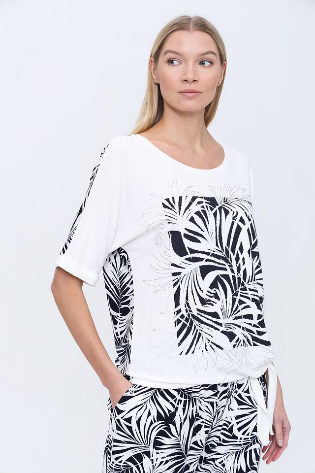 Основной цвет футболки – белый, а главным акцентом является яркий и стильный принт в виде абстрактных листьев, выполненный в чёрно-белой гамме. Принт расположен на передней части изделия и придает ему оригинальность.