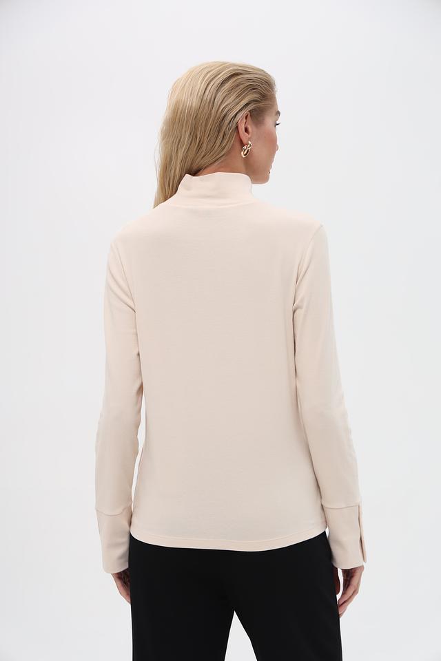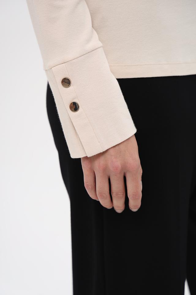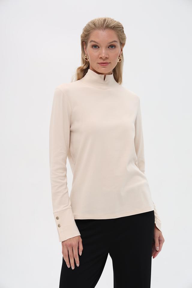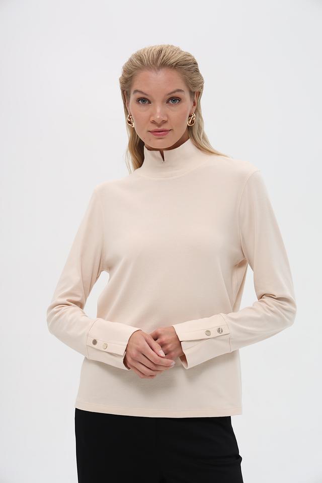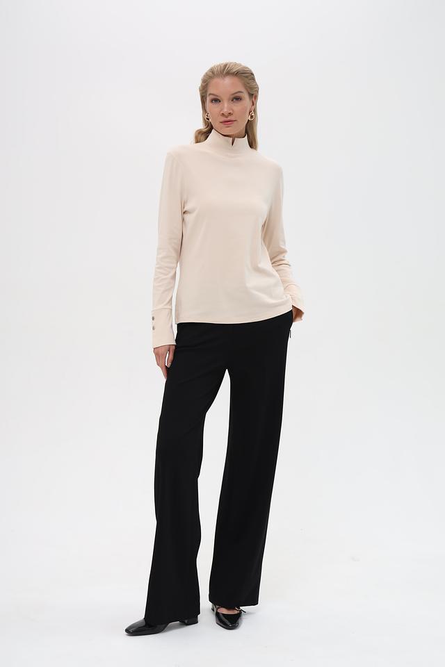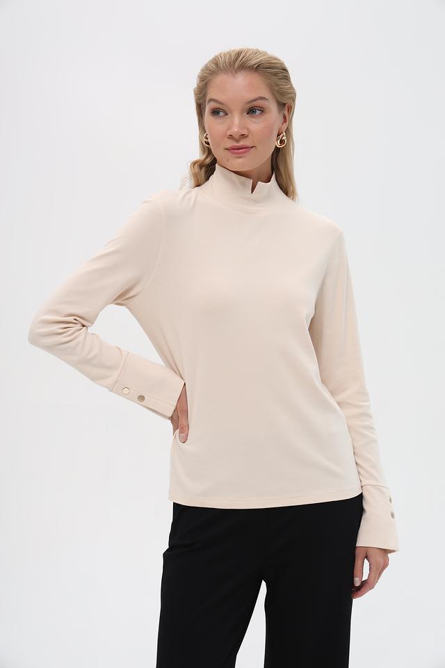 Модель имеет классический крой с длинными рукавами и высоким воротником-стойкой. На рукавах расположены декоративные пуговицы в тон изделия, которые придают водолазке особый шарм.