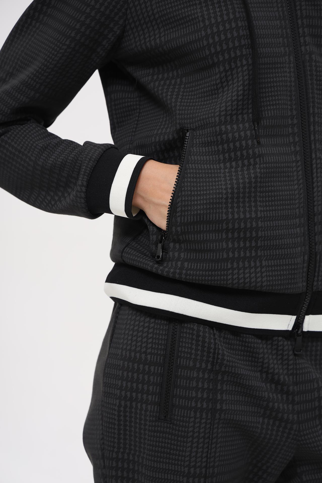 - Дизайн и детали: Толстовка оснащена удобной молнией по всей длине, двумя боковыми карманами на молнии и капюшоном, который регулируется шнурками. Манжеты и нижняя часть толстовки украшены контрастной трикотажной резинкой с белыми полосками, добавляя изделию динамичности.