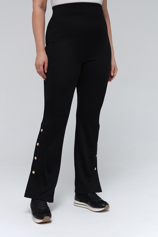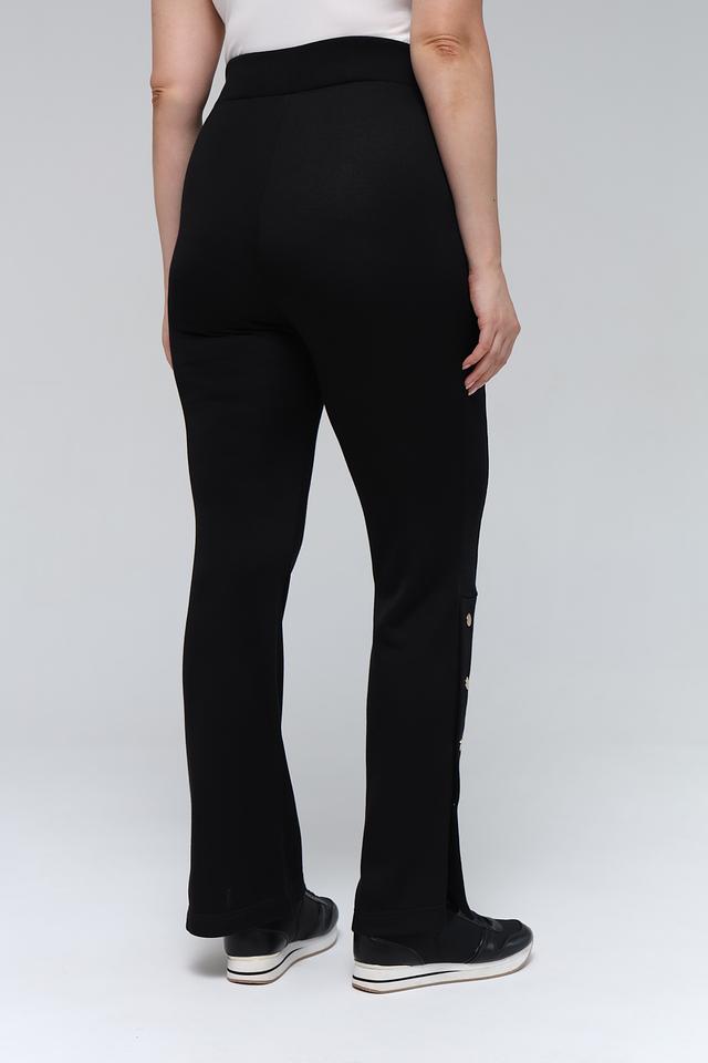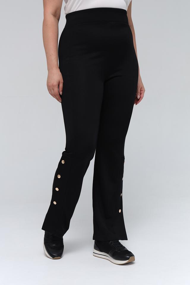Брюки имеют высокую посадку и слегка расклешенный к низу силуэт, что визуально удлиняет ноги и создает женственный образ. Отличительной особенностью данной модели является ряд декоративных золотистых пуговиц вдоль бокового шва, которые придают брюкам особый шарм.