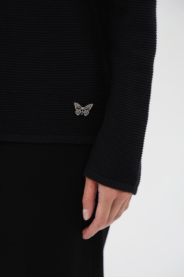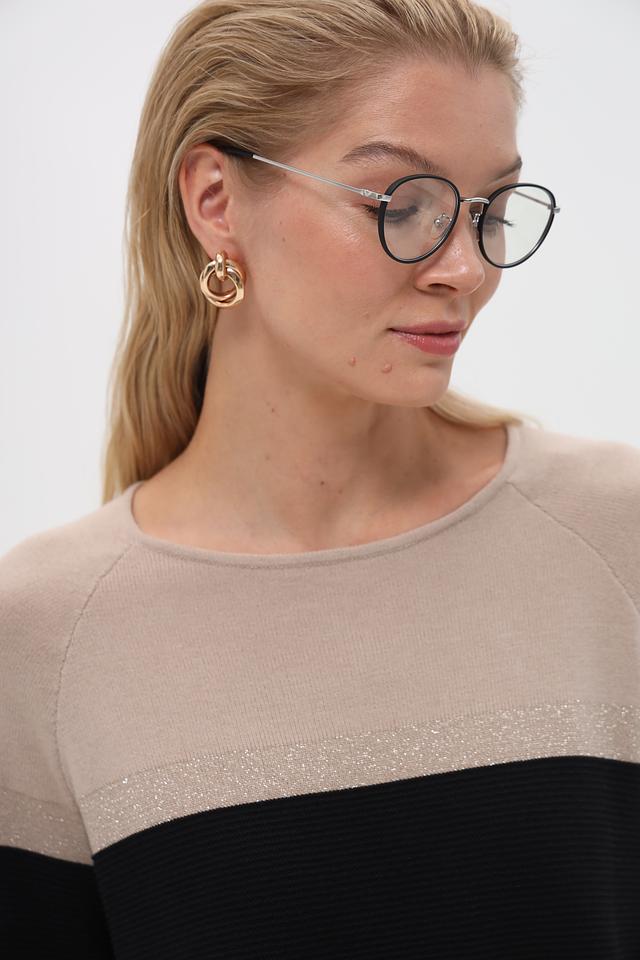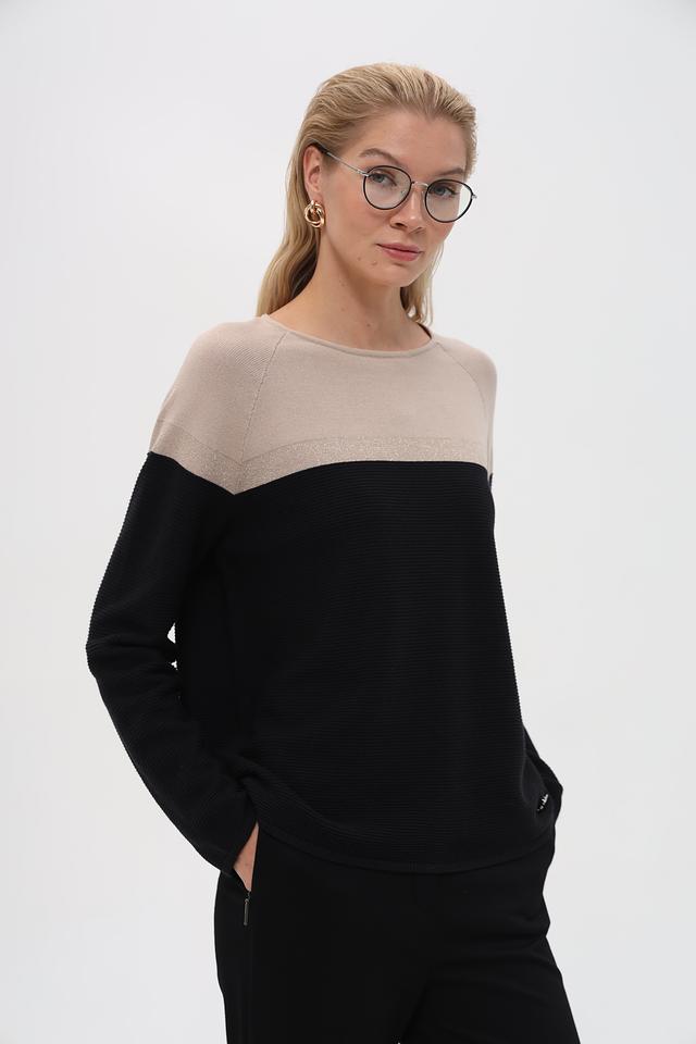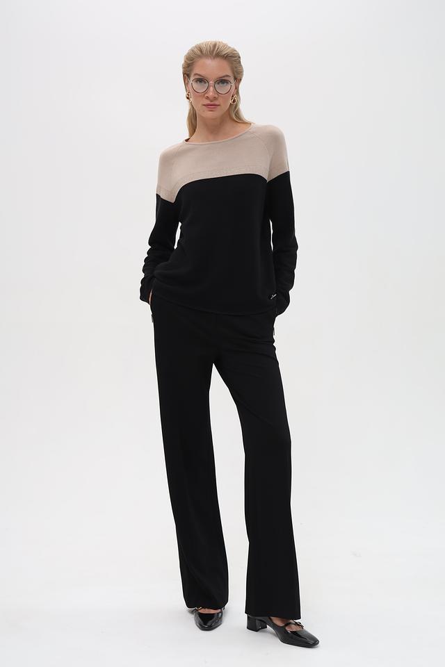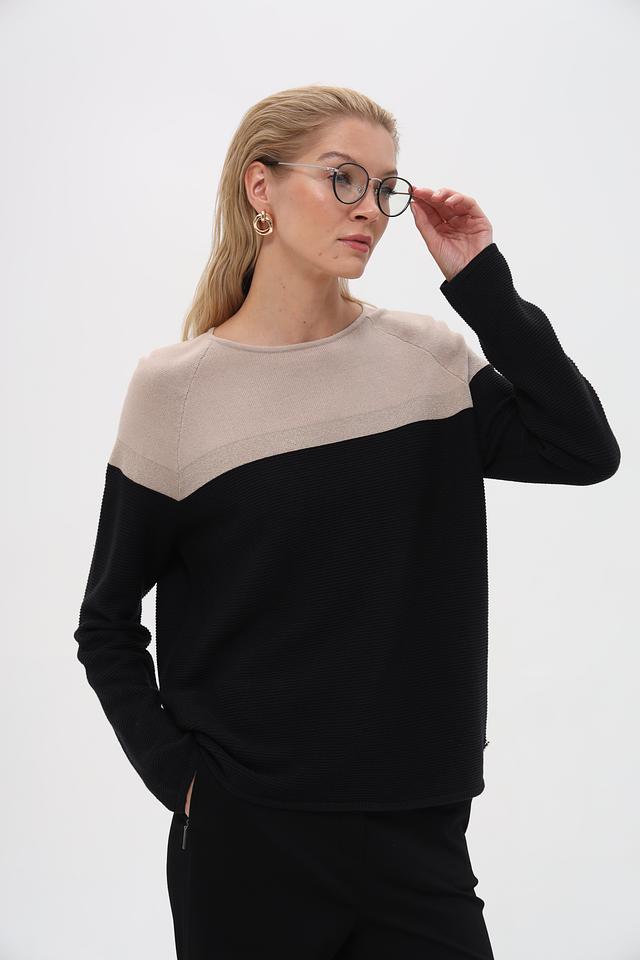 Верхняя часть пуловера выполнена из гладкого бежевого трикотажа, а нижняя – из текстурированного чёрного вязаного полотна. Такое сочетание фактур делает этот пуловер особенно интересным и привлекательным. Небольшой логотип бренда расположен на груди.