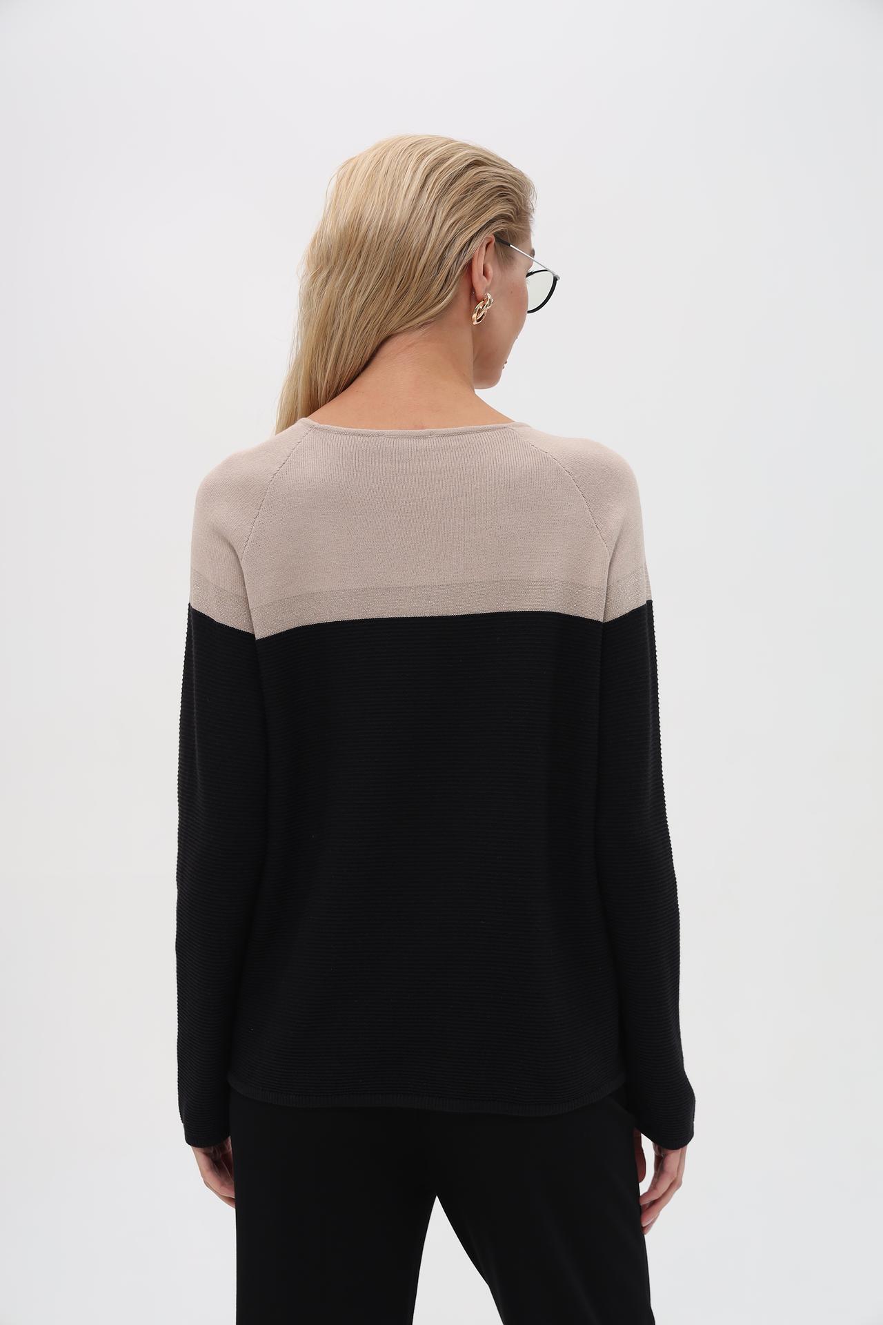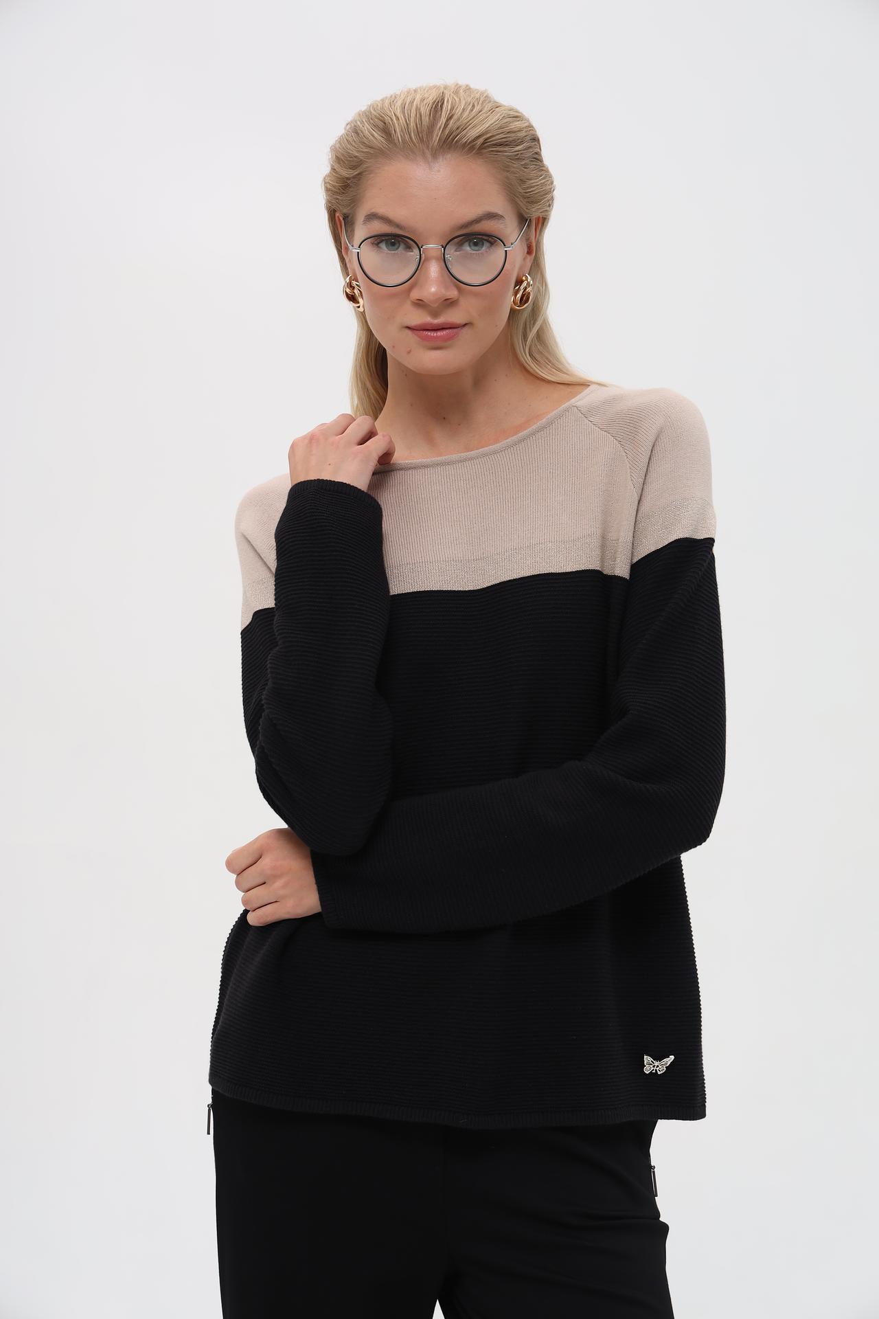 Верхняя часть пуловера выполнена в нежном бежевом цвете с деликатной серебристой нитью, создающей эффект мерцания. Нижняя часть и рукава — в глубоком черном цвете с фактурной вязкой, добавляющей текстуру и глубину.