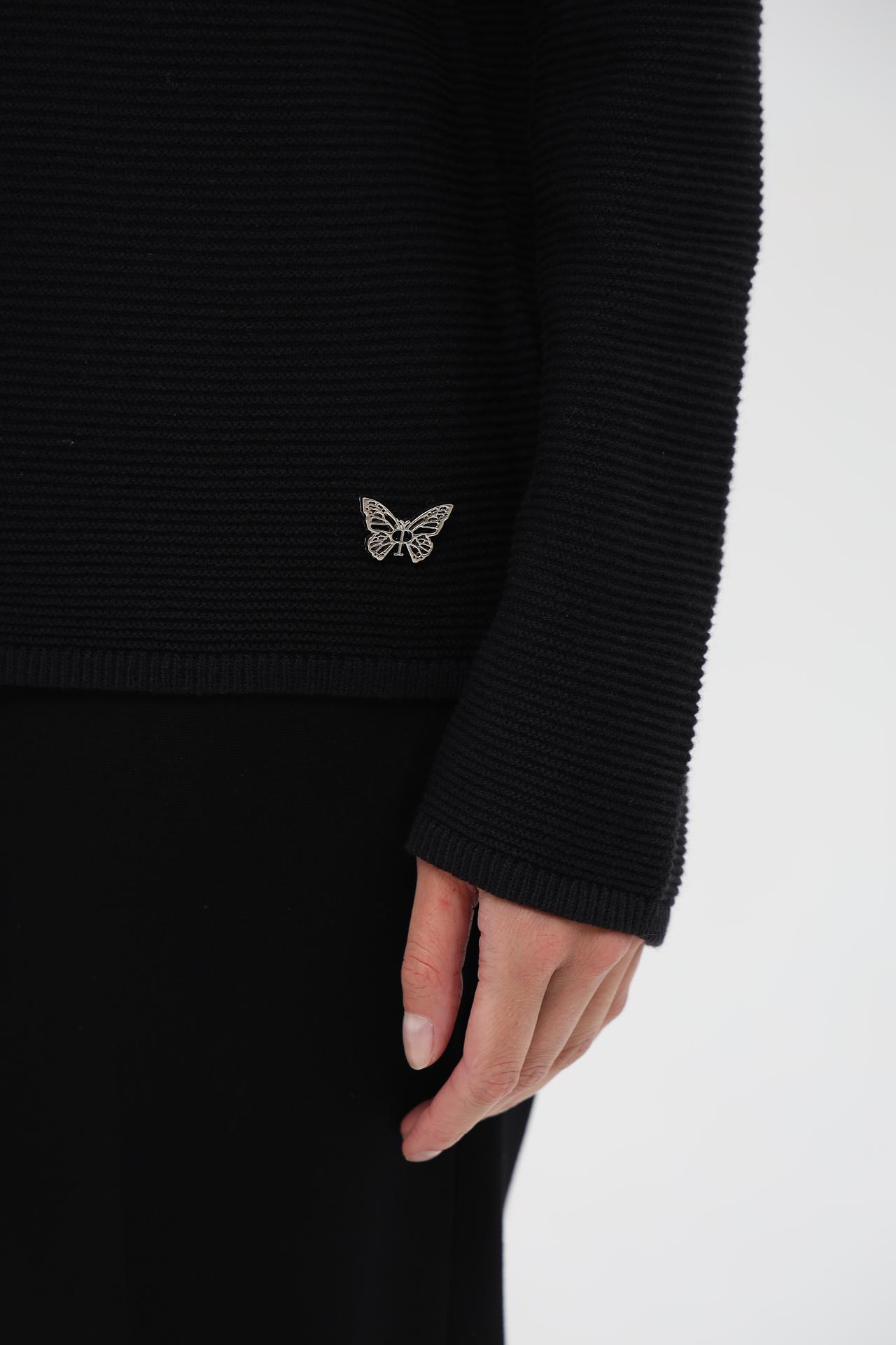 Модель отличается классическим, универсальным дизайном. Оригинальный акцент — небольшая брошь в виде бабочки на левой стороне изделия, придающая образу женственности и утонченности. Круглая горловина и рукава реглан обеспечивают комфортную посадку.