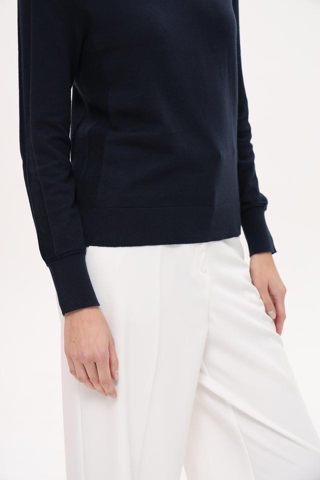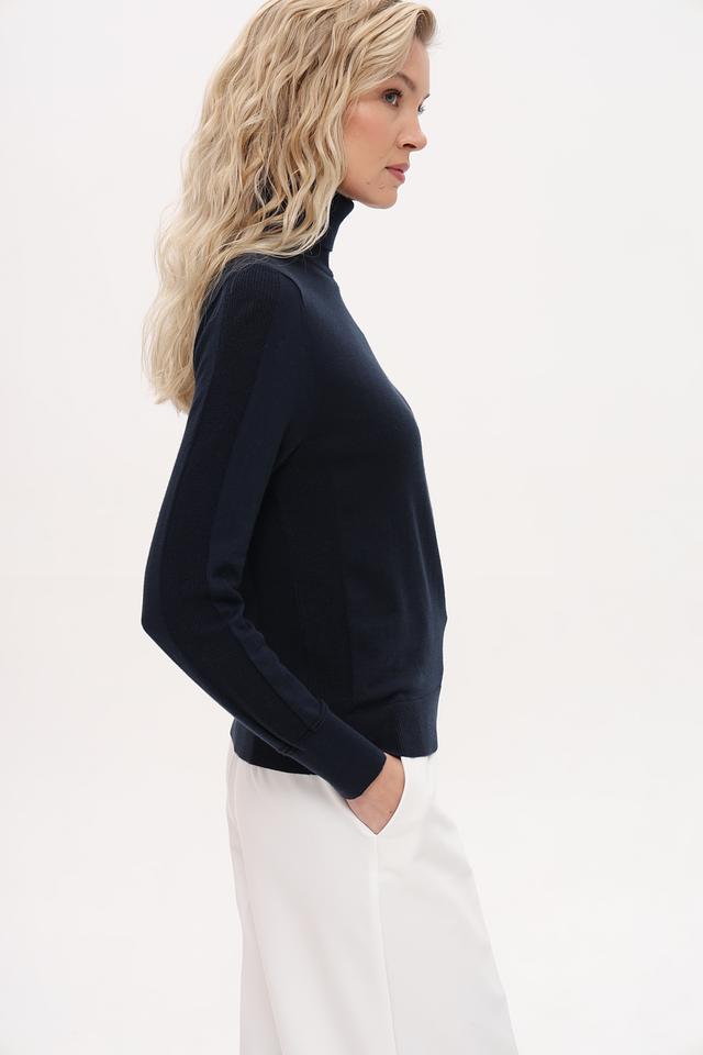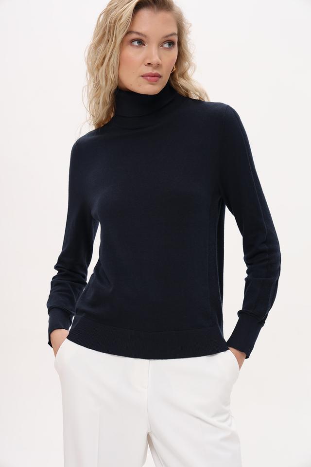 Водолазка имеет длинные рукава и классический круглый вырез горловины. Тёмно-синий цвет делает её универсальной и легко сочетаемой с другими элементами гардероба. Материал приятен к телу и не сковывает движений.