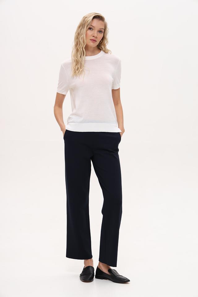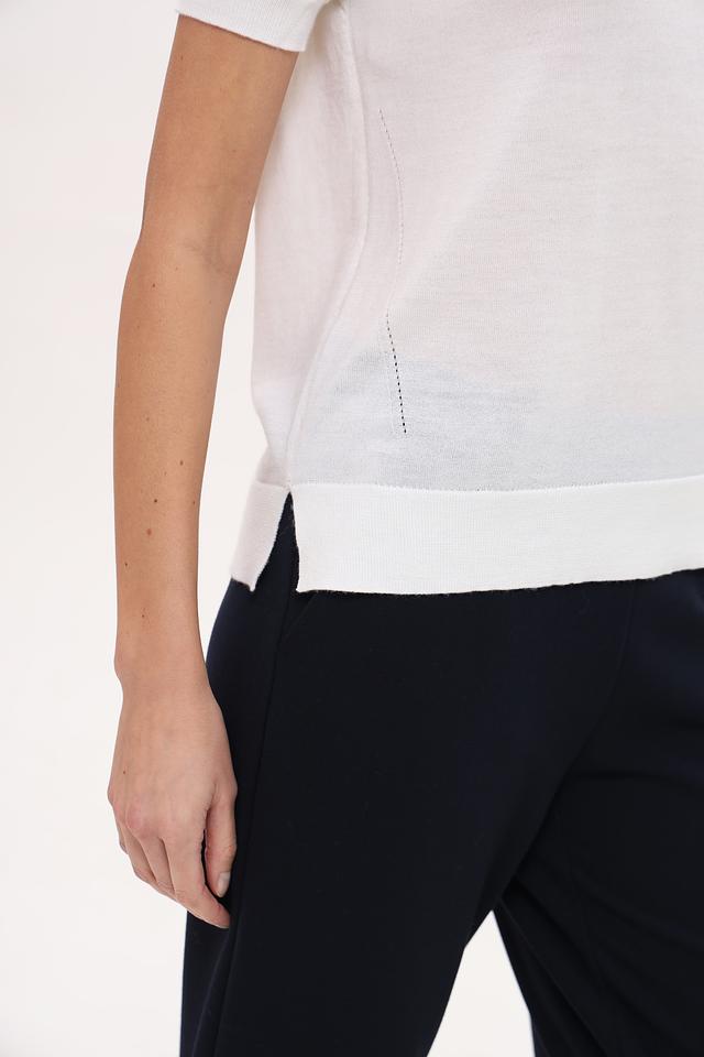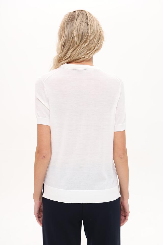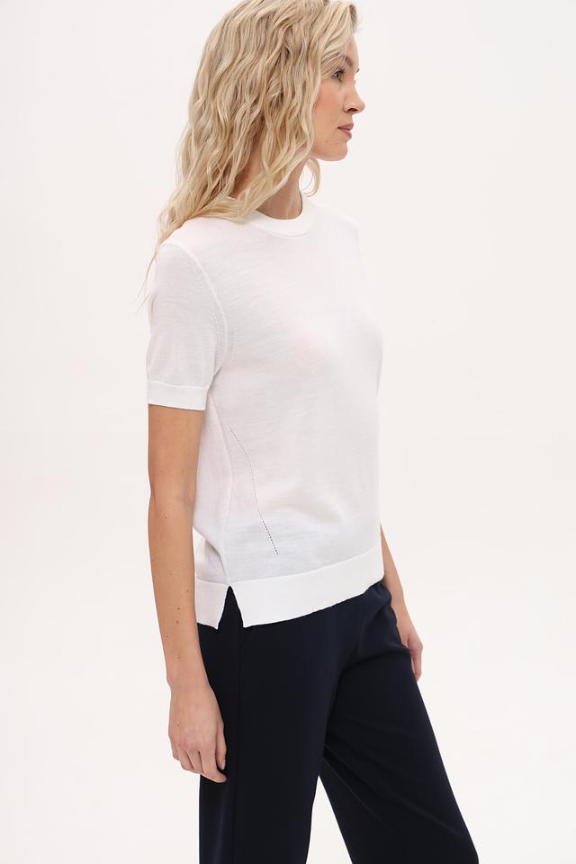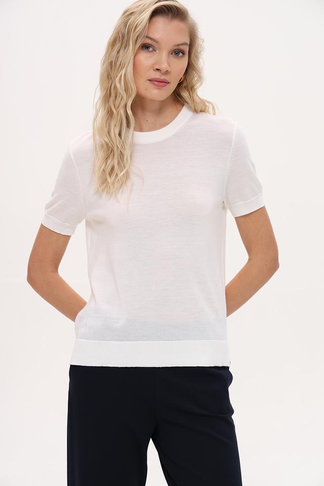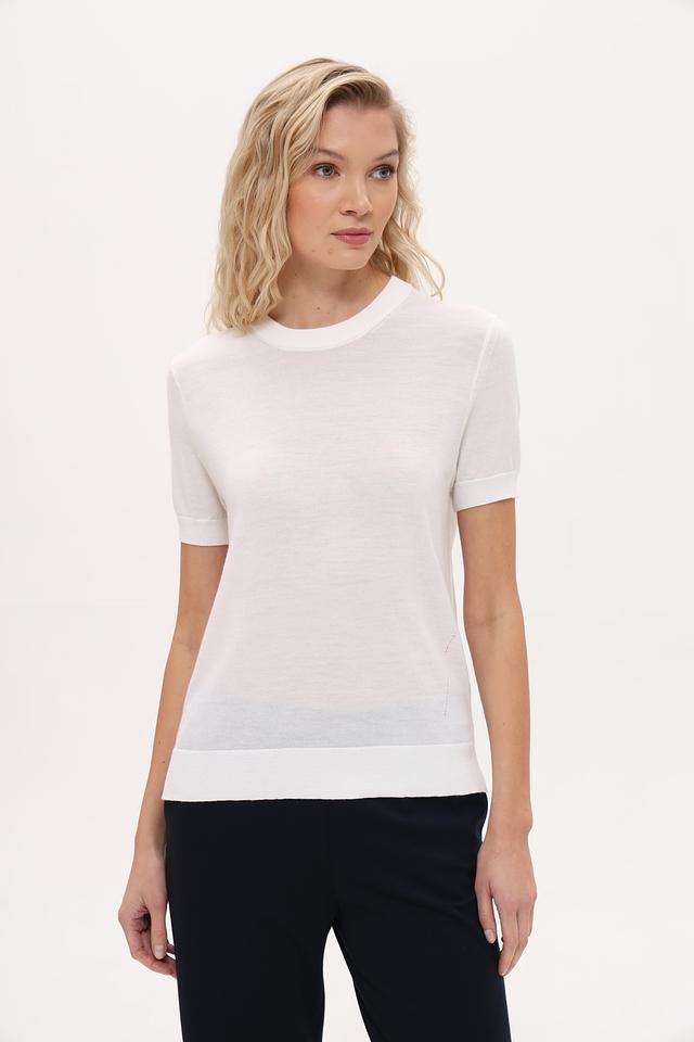 Пуловер имеет прямой крой и короткий рукав, что придает ему современный и непринужденный вид. Круглый вырез горловины подчеркивает элегантность силуэта. Тонкая вязка подчеркивает качество материала и создает ощущение легкости.
