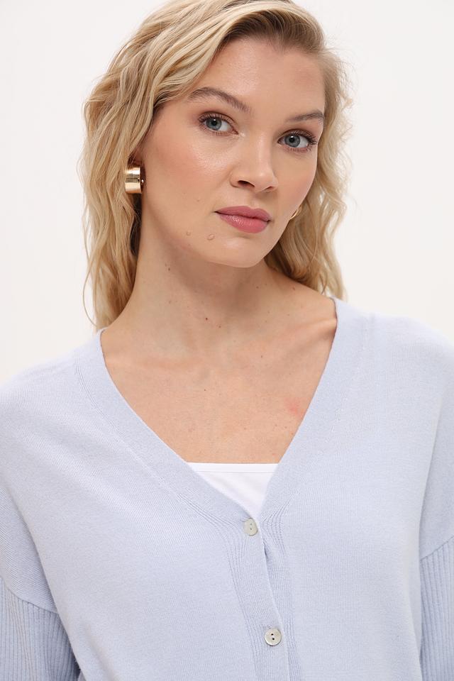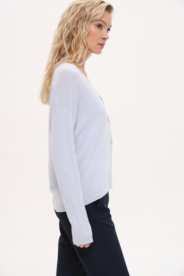 Нежный голубой цвет жакета придаёт образу лёгкость и свежесть. Вязаная текстура добавляет изделию объём и уют. Этот жакет станет незаменимой вещью в вашем гардеробе, позволяя создавать стильные и комфортные образы на каждый день.