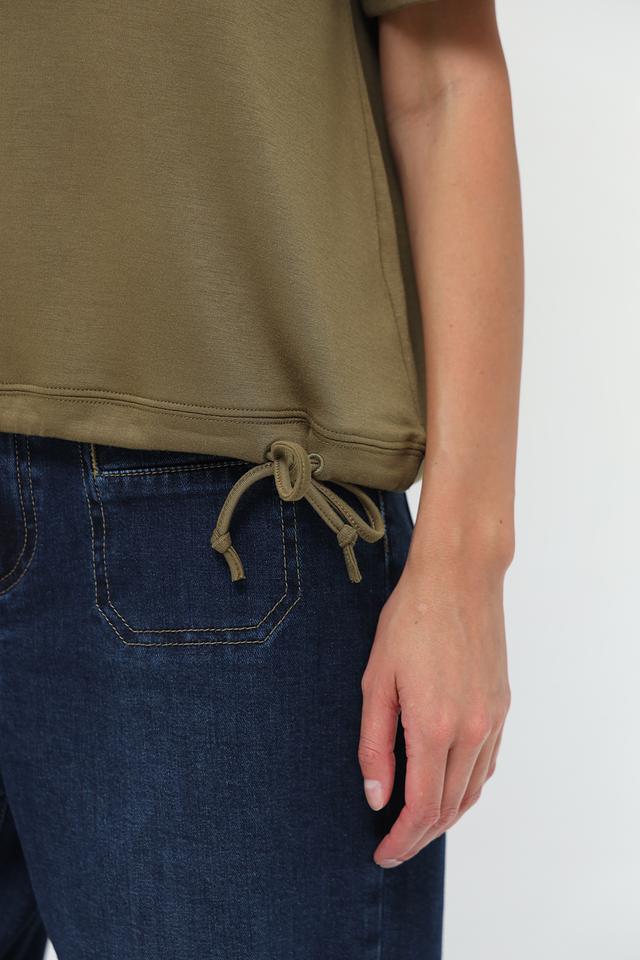 Женский пуловер Pezzo цвета хаки с коротким рукавом и завязками по бокам. Изготовлен из мягкого и приятного к телу сочетания вискозы, полиэстера и эластана. Состав: район 82%, полиэстер 14%, эластан 4%