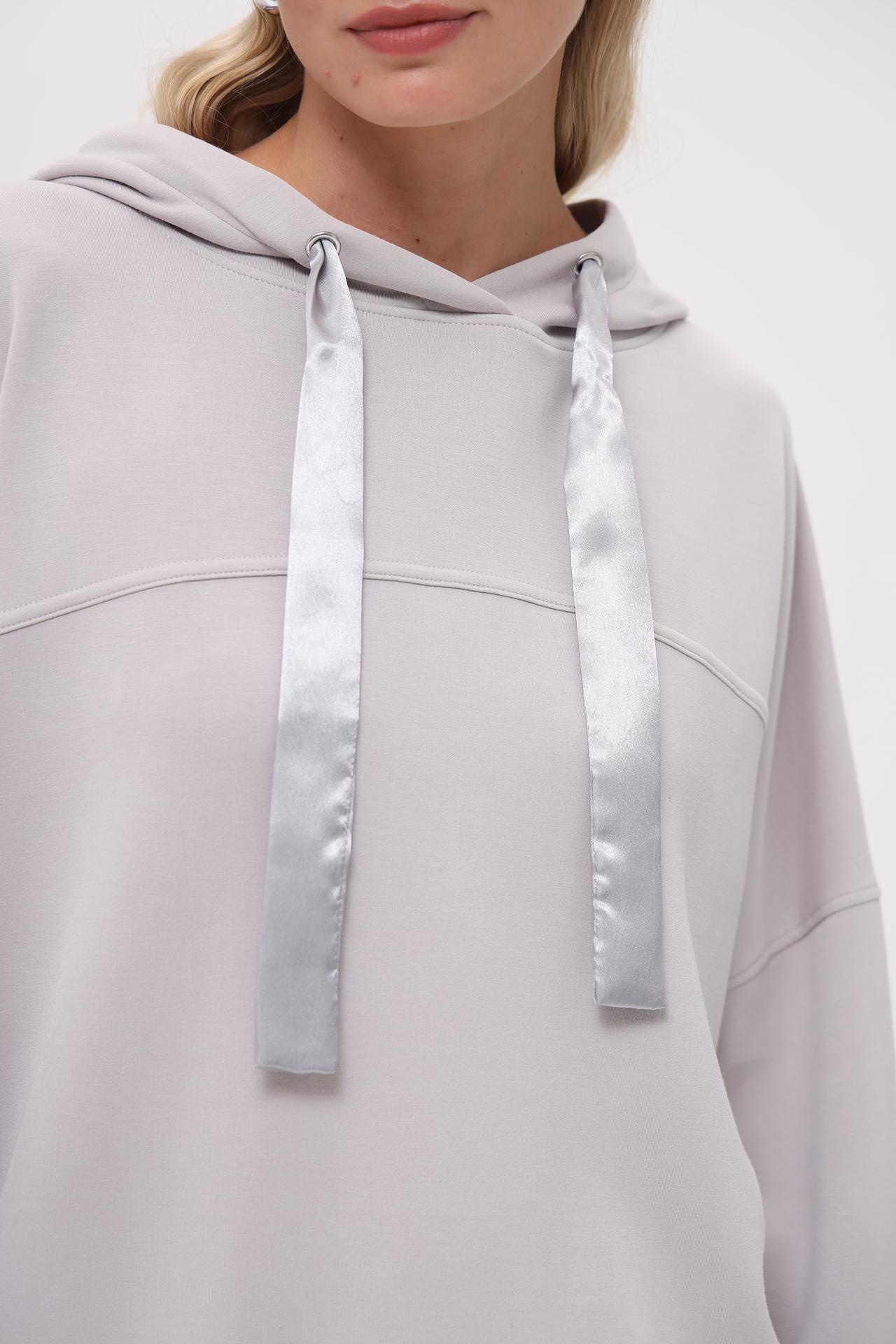 - Дизайн и крой: Свободный силуэт и актуальный серый цвет подчеркивают современный стиль. Модель оснащена удобным капюшоном и украшена контрастными атласными лентами, которые придают ей особую элегантность и очарование.