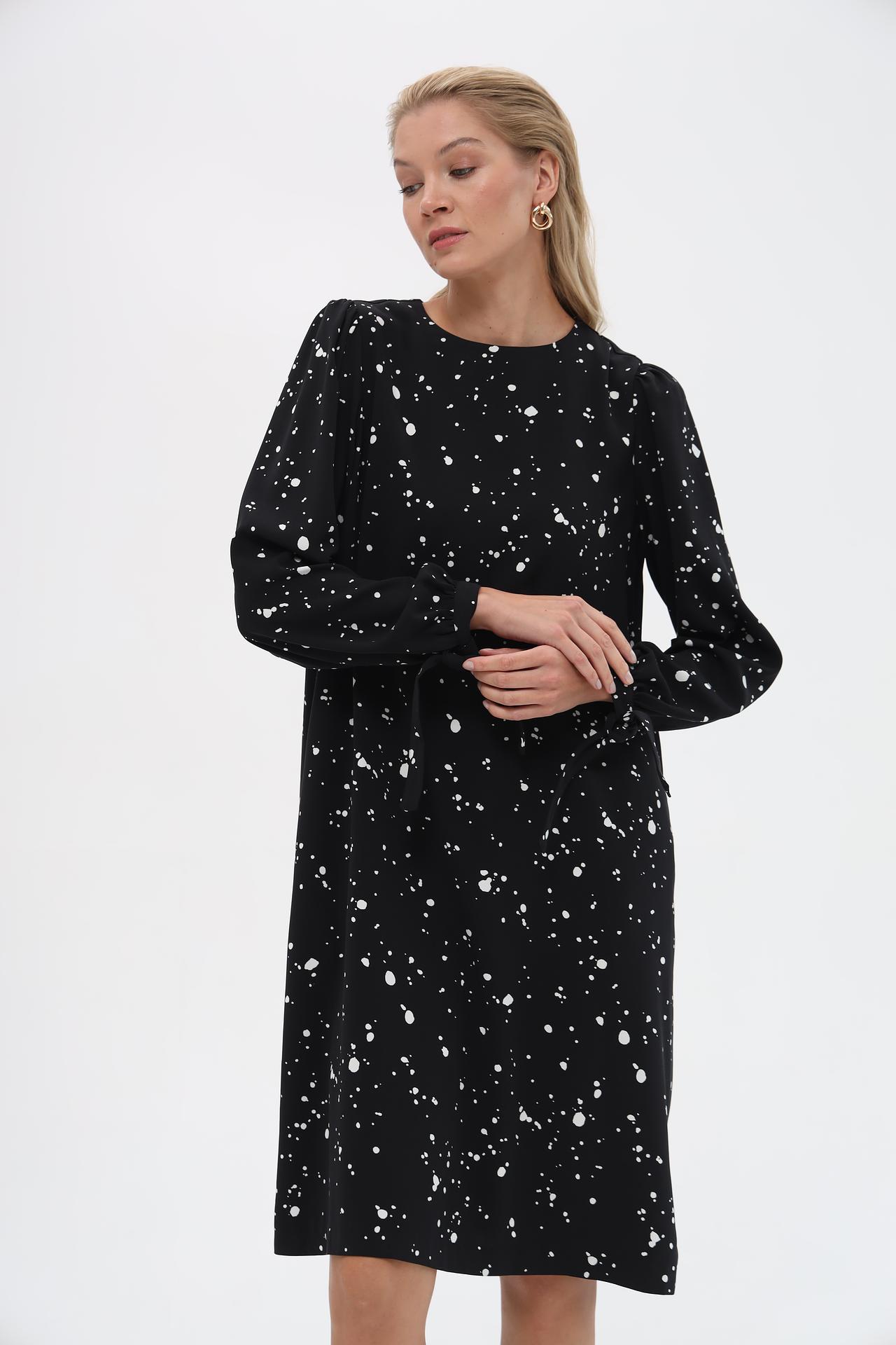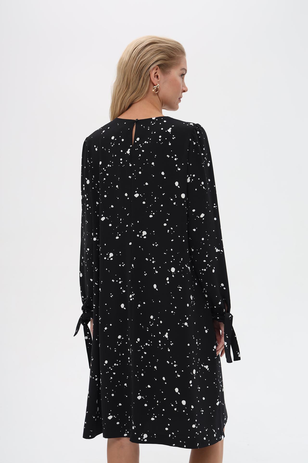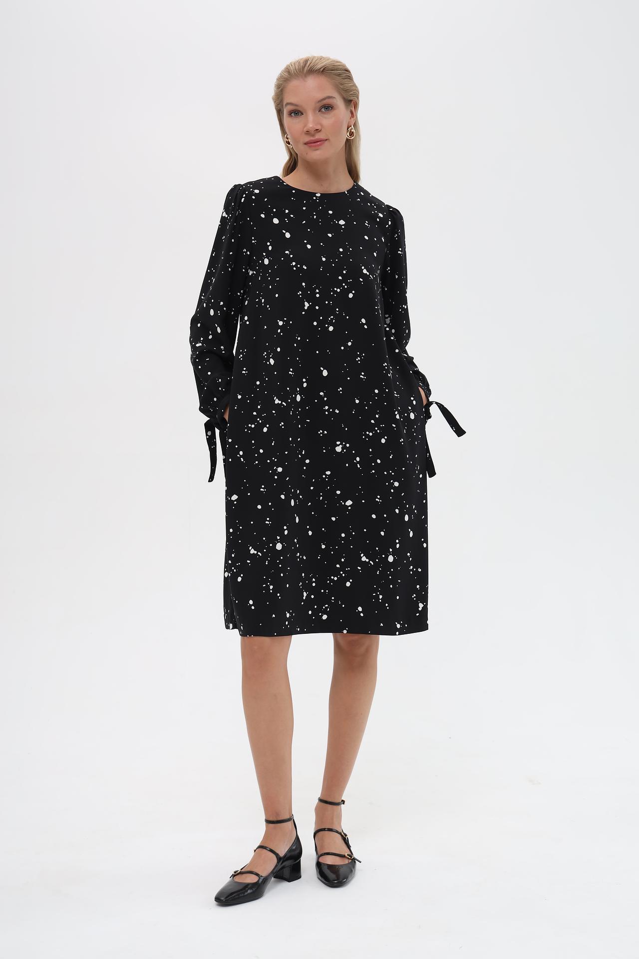 Лаконичный крой платья подчеркивает достоинства фигуры, а оригинальный принт в виде брызг добавляет образу динамичности и индивидуальности. Длинные рукава с манжетами, украшенными бантами, придают изделию женственности и изысканности. Платье отлично подойдет как для повседневного ношения, так и для особых случаев.