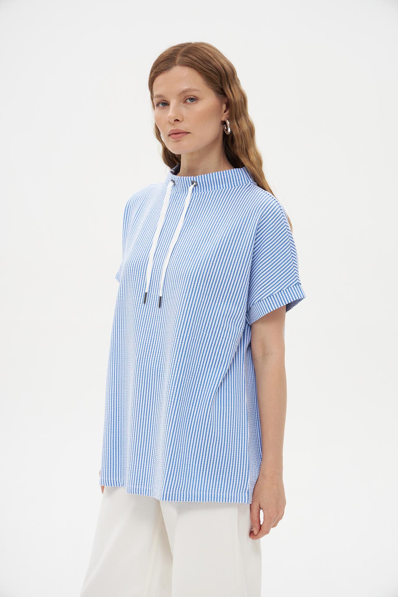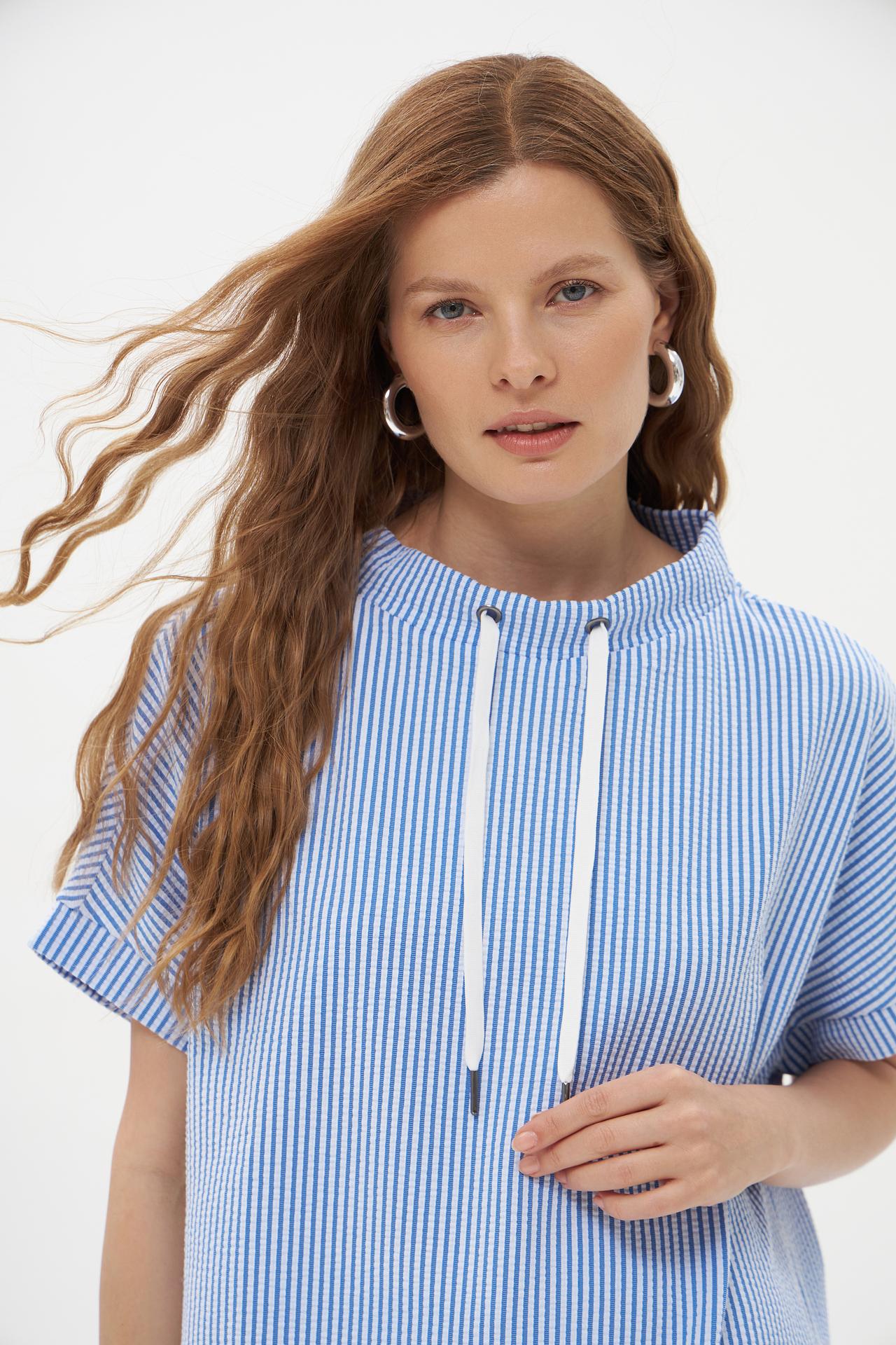 - Стильный дизайн: Классическая вертикальная голубая полоска визуально стройнит, а воротник-стойка с функциональными белыми шнурками придает изделию современный и динамичный вид. Это универсальная блуза, которая легко сочетается с различными элементами гардероба.