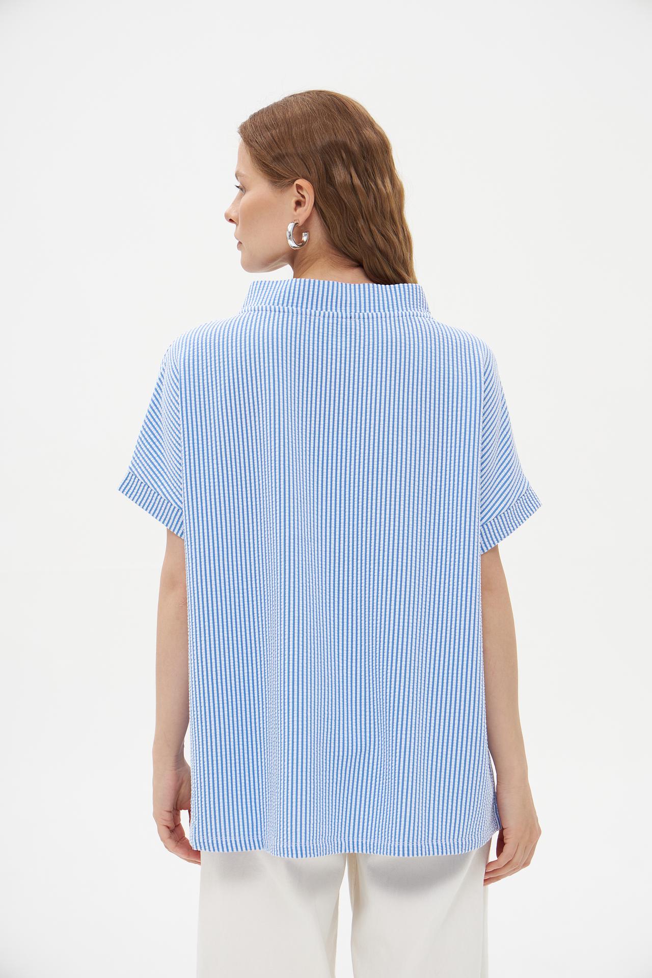 Эта женская блуза Pezzo в свежую голубую полоску идеально подходит для создания легких и стильных летних образов. Свободный крой и текстурная ткань обеспечивают максимальный комфорт и непринужденный вид, делая ее незаменимой частью повседневного гардероба. Современный дизайн с воротником-стойкой и белыми шнурками добавляет изюминку.