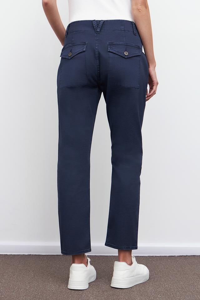 Брюки имеют прямой крой и клёш от колена, что придает им современный и модный вид. Наличие накладных карманов добавляет практичности и оригинальности. Изготовлены из высококачественного хлопка с добавлением эластана, обеспечивающего комфорт при носке и хорошую посадку по фигуре.