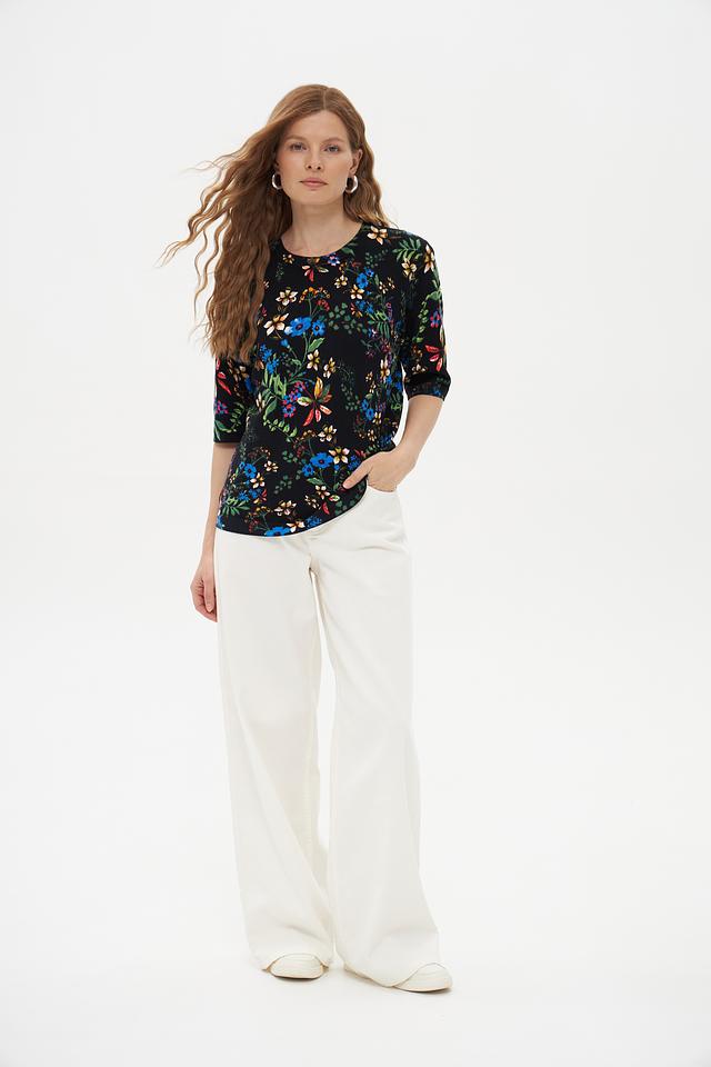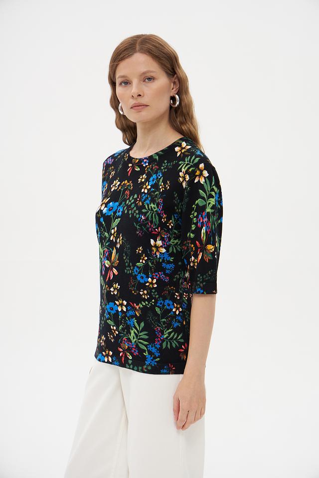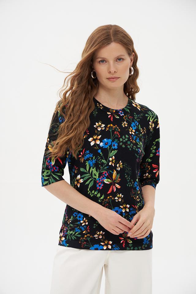 Этот женский пуловер от бренда Pezzo выполнен в чёрном цвете и украшен красочным цветочным принтом. Модель имеет круглый вырез горловины и короткие рукава, что делает её идеальным выбором для тёплой погоды.