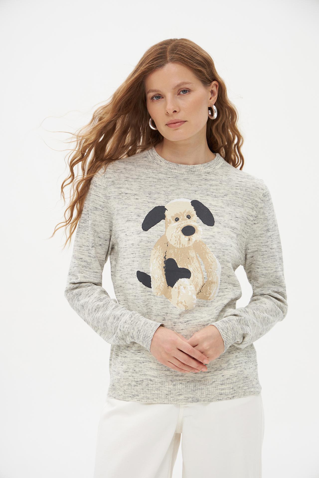- Дизайн: Классический крой и спокойная цветовая гамма пуловера дополнены ярким и запоминающимся принтом в виде собаки. Такой дизайн подойдет как для любителей минимализма, так и для тех, кто предпочитает добавлять в свой образ акцентные детали.