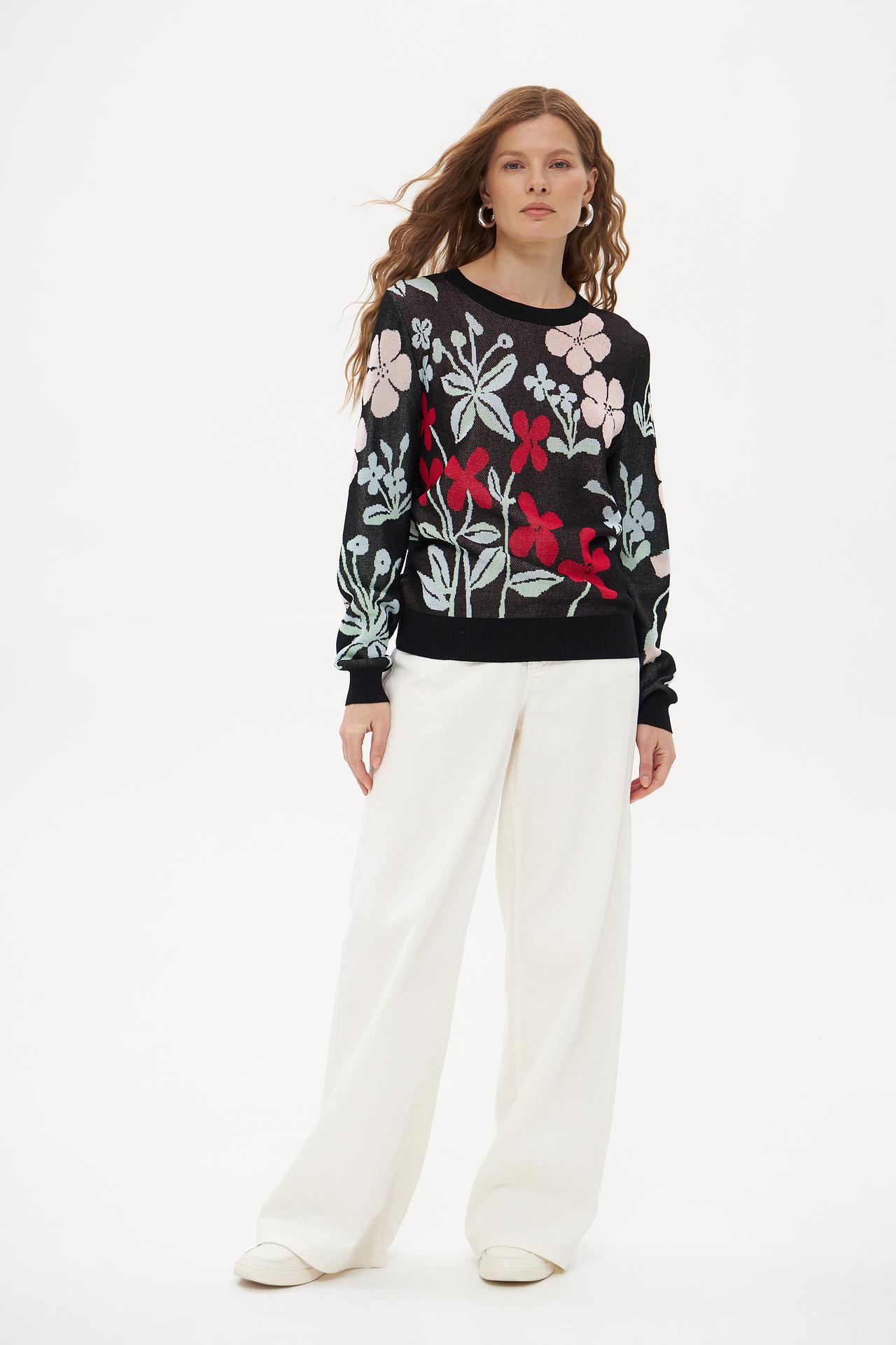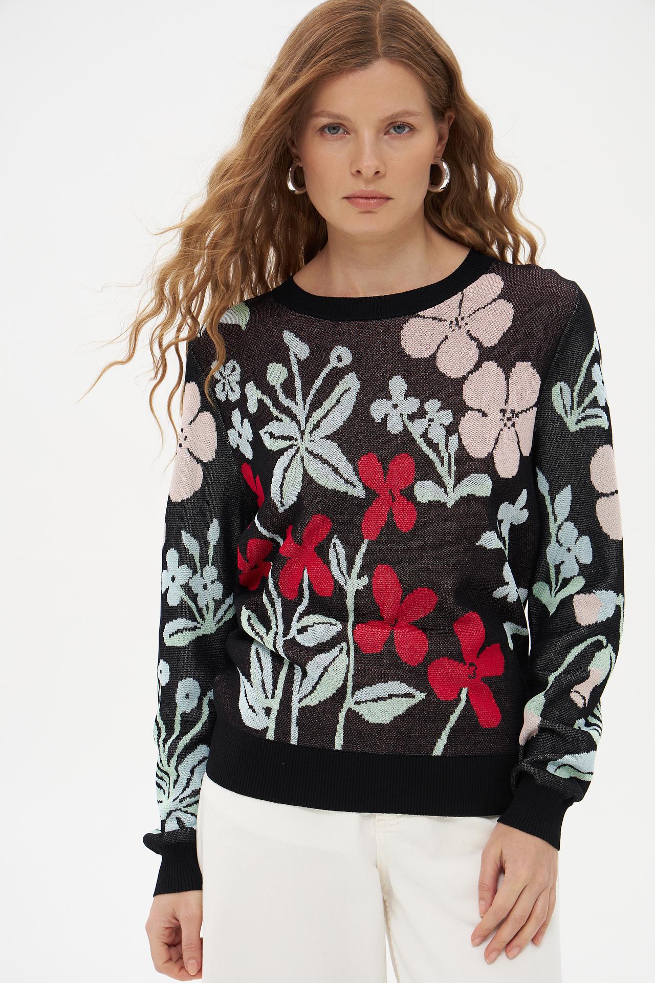 - Дизайн: Классический крой и круглый вырез горловины делают пуловер универсальным. Яркий цветочный принт на черном фоне выглядит очень выразительно и привлекает внимание.