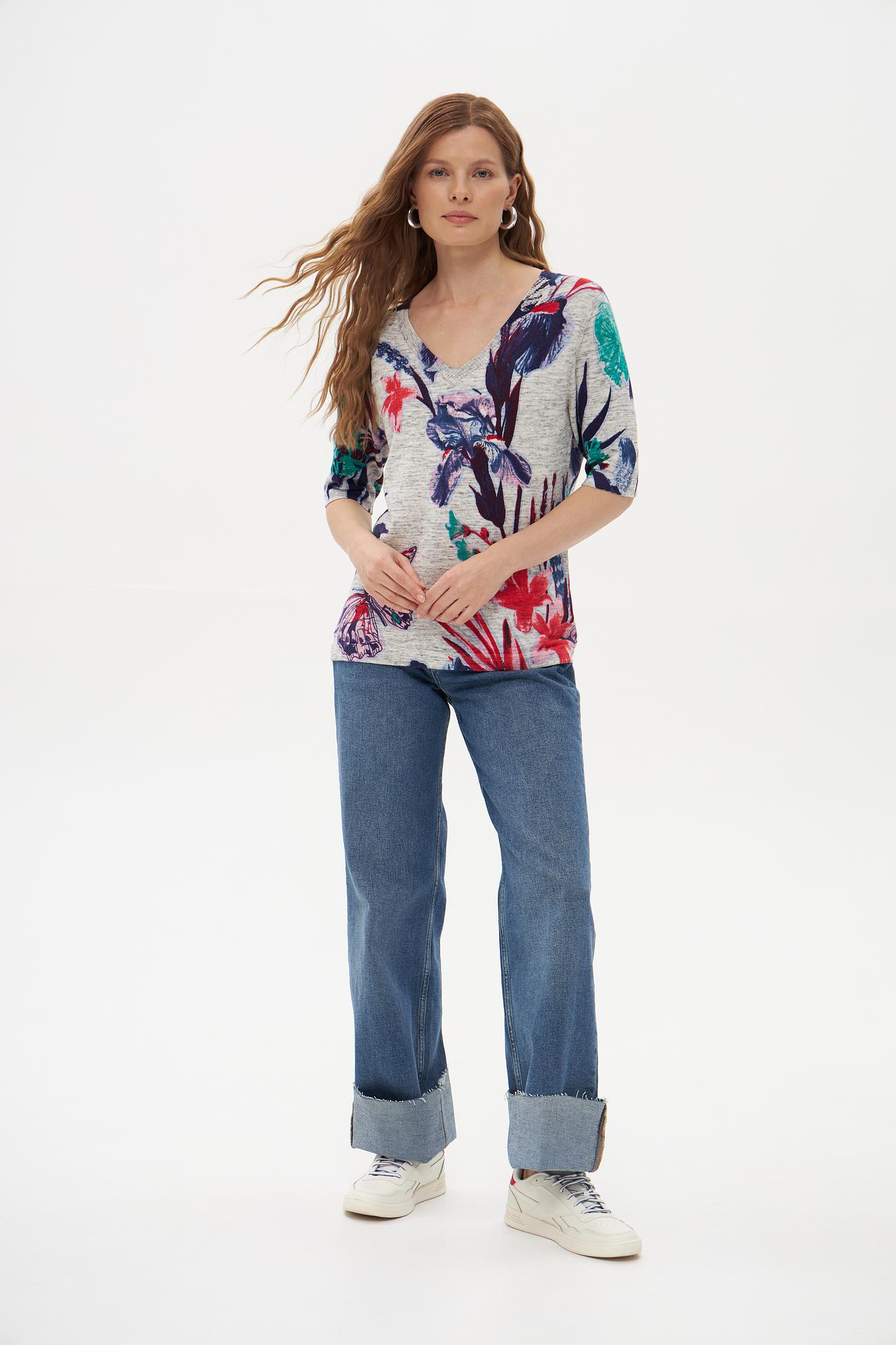 - Цвет: Серый меланж с многоцветным принтом. Универсальная база, которая легко сочетается с другими элементами гардероба.