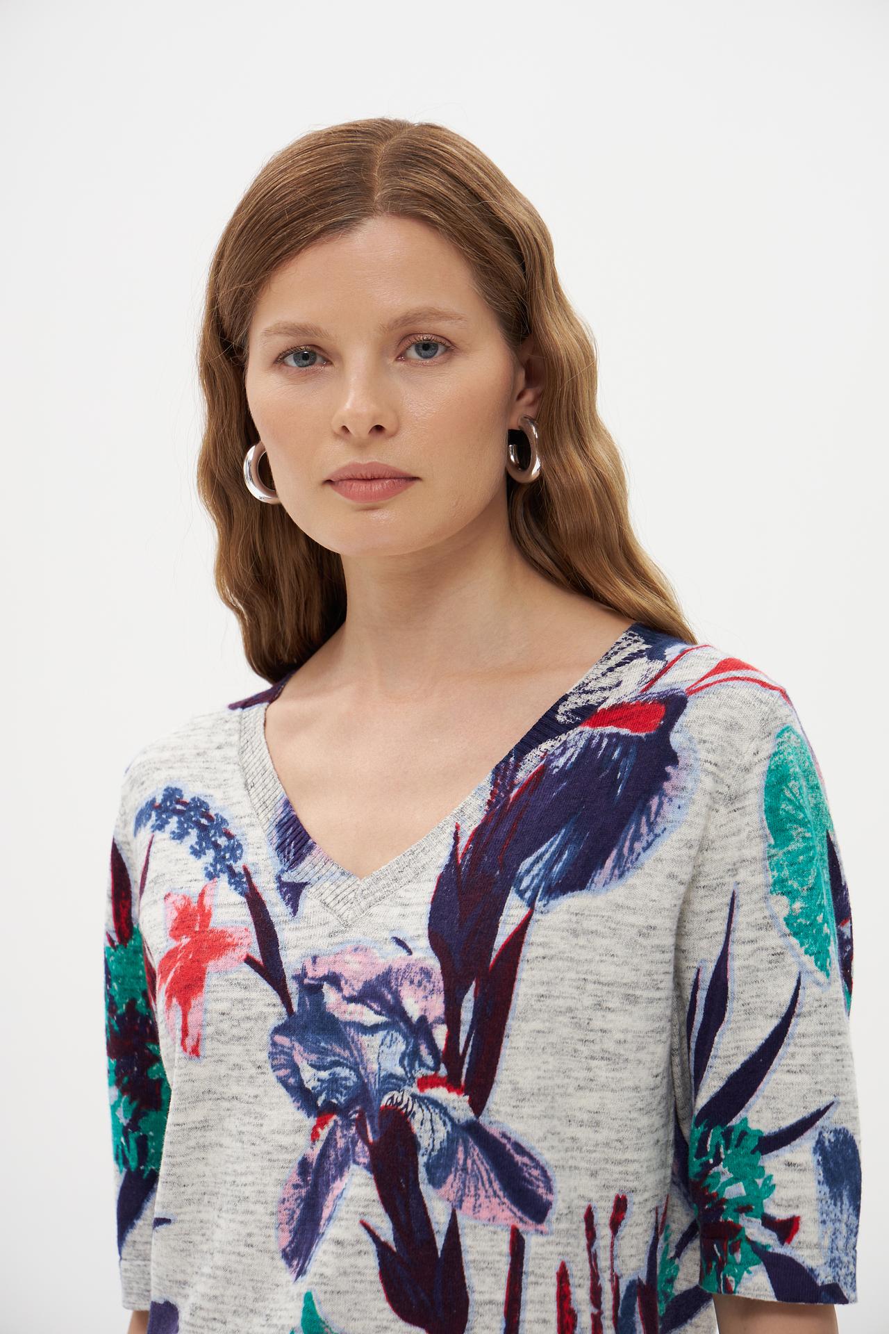 Элегантный пуловер Pezzo, выполненный из 100% хлопка, станет незаменимой основой вашего летнего гардероба. Оригинальный цветочный принт с изображением ирисов и бабочек придаст образу женственности и романтичности. Нежный серый меланжевый фон выгодно подчеркивает яркость красок, делая эту модель универсальной для создания различных стилей.